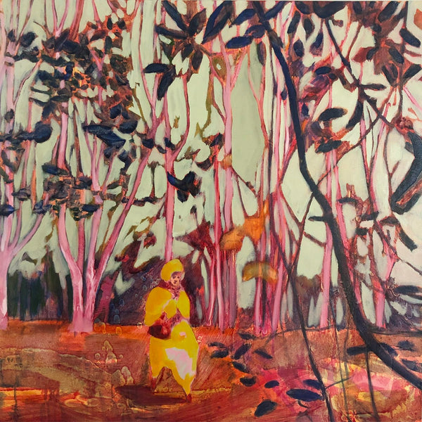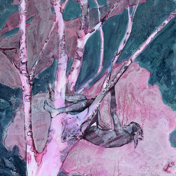 From here, he allows the abstract nature of the paint to influence the direction the painting will take, enjoying the way in which the composition, palette and subsequent layers are guided and influenced by the spontaneous marks and colours below.