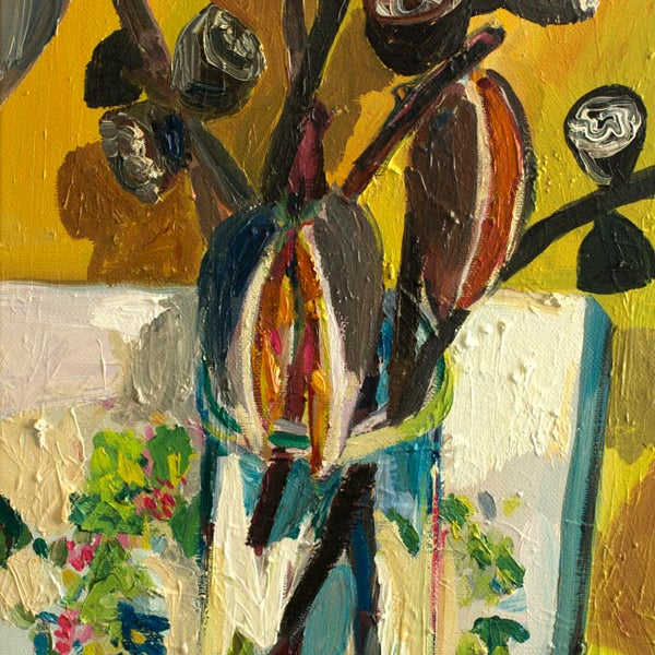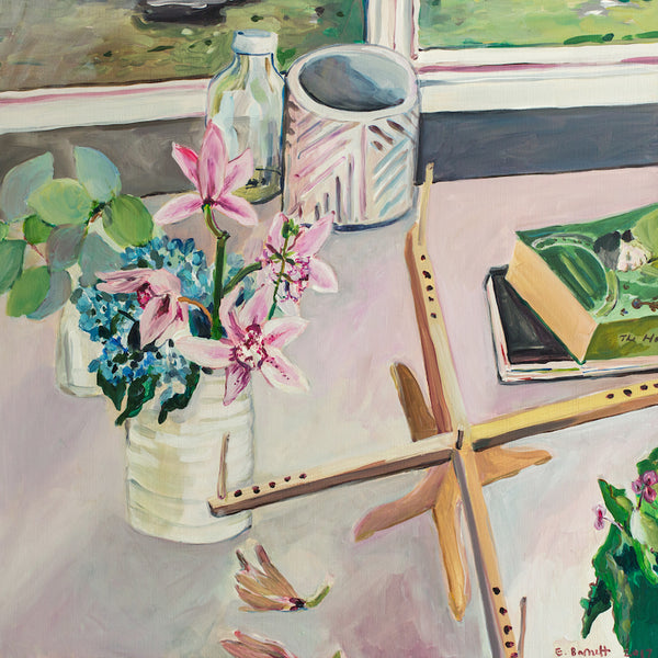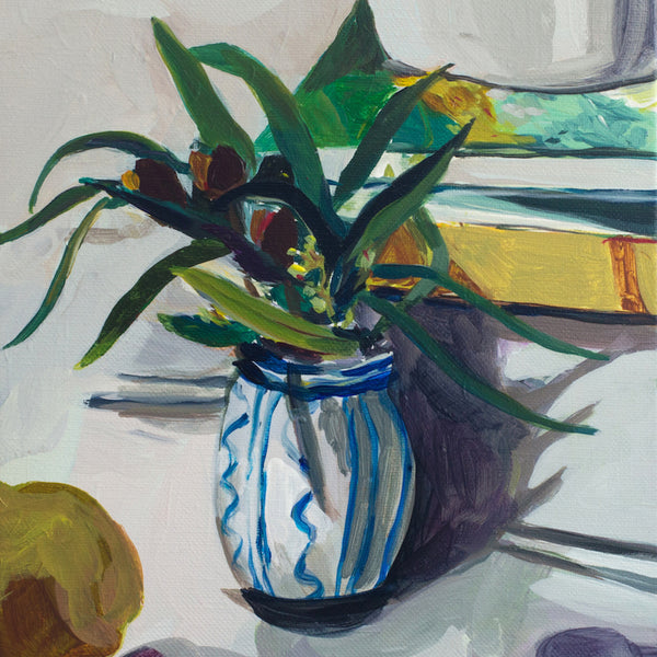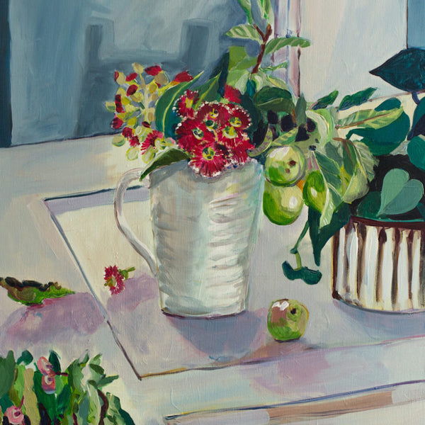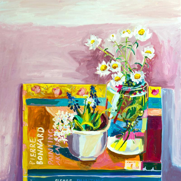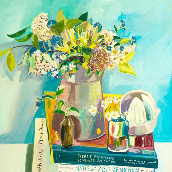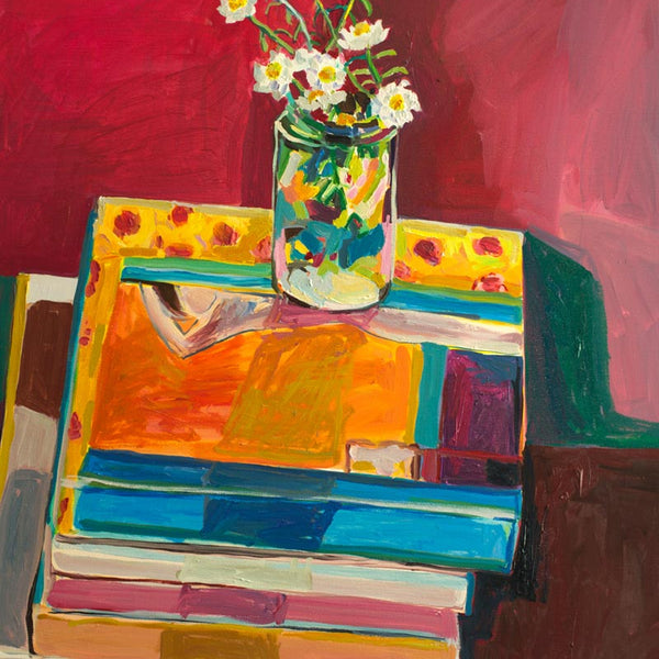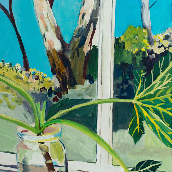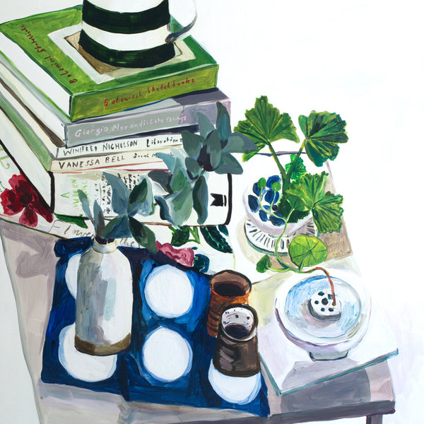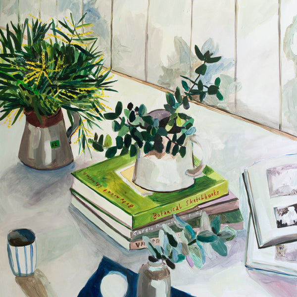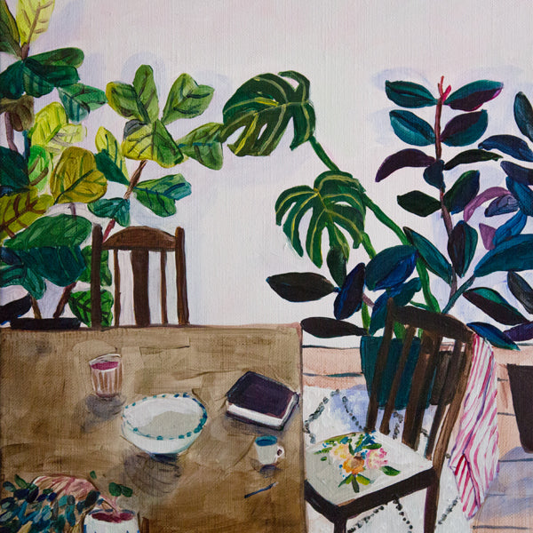 "My work combines everyday experiences and encounters through painting, printmaking and illustration. Domestic ephemera such as plants, books, figures, tea cups and newspaper features predominately. In my recent series of paintings I have created spaces that I can go to and that are mine alone to escape the everyday. Spaces where things that I love, objects beautiful and quiet, surround me. These paintings offer momentary rest and sanctuary from everyday life. They are spaces that the eye can rest with and find solace in. The viewer catches the figures mid-pause and between breaths. Empty spaces appear recently vacated by a figure who leaves behind half-eaten toast or an open book. These spaces are lived in and warming, filled with plant life, chairs, coffee cups, pot plants and beds."