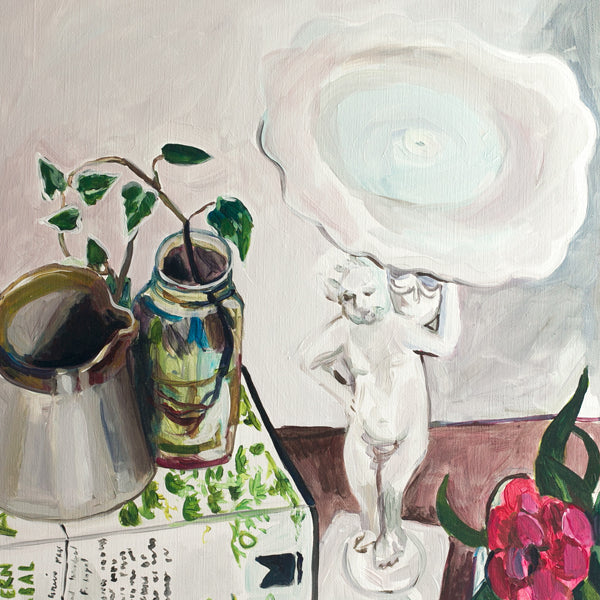 "The paintings are composed of found images from my own collection and of my friends’ homes and the homes of strangers that I admire. They are composed of objects in my life that give me joy and help to shape my spaces at home and in the studio."