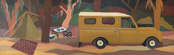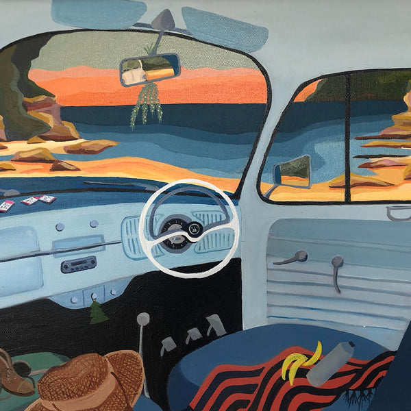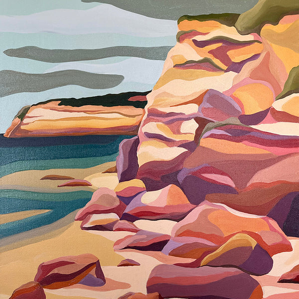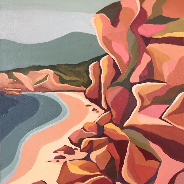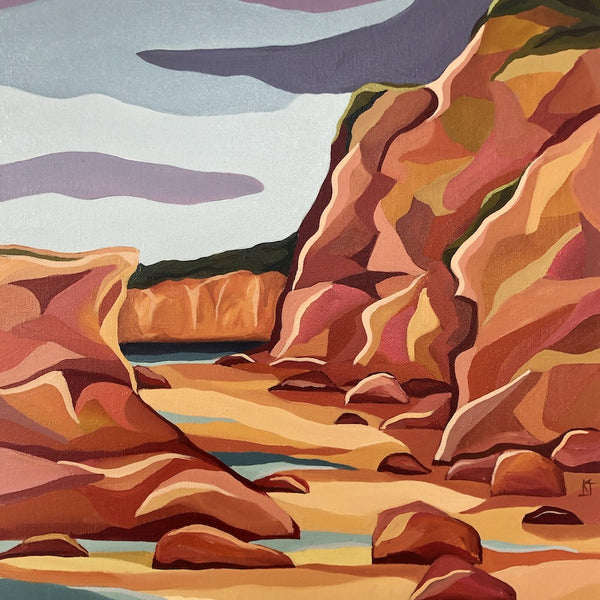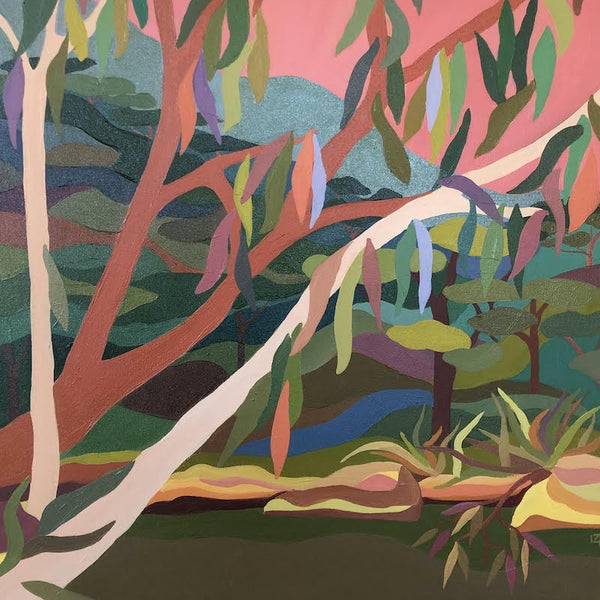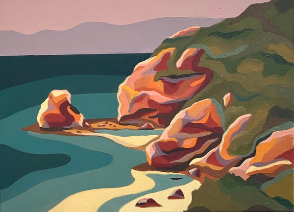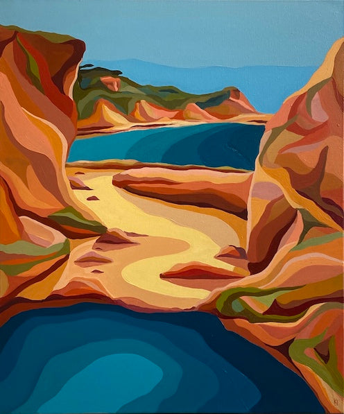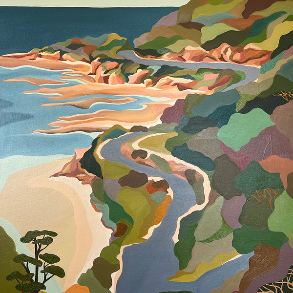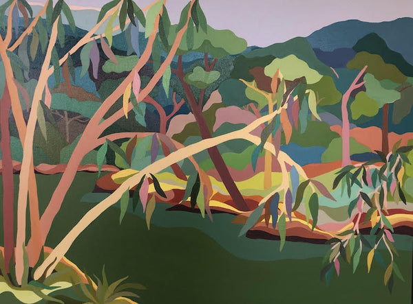 Kathryn's paintings are drawn from lived experience of a place with a hint of imagination. Influenced by the cubist movement and the way they reduced their subjects to geometric forms, Colour palettes are arrived by saturating hints of colours found in nature. By combining these two approaches in tandem with strong graphic qualities and use of pattern, Kathryn's work straddles abstraction and representational approaches to painting.