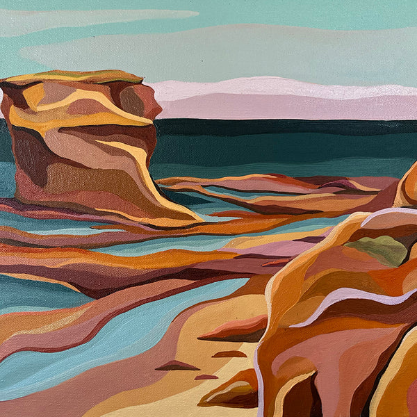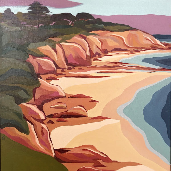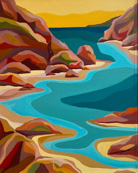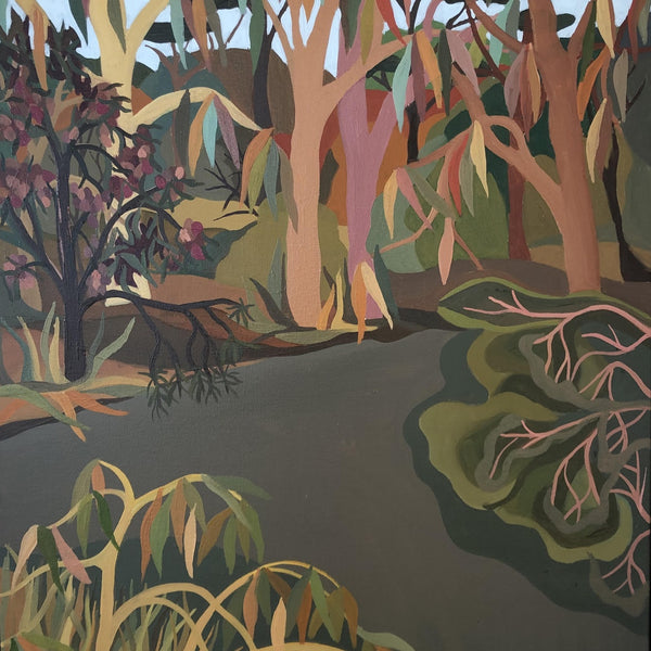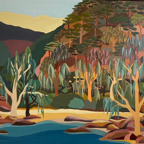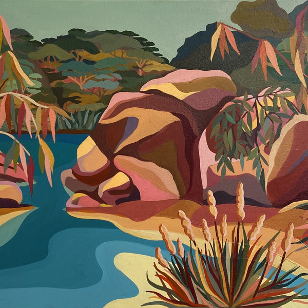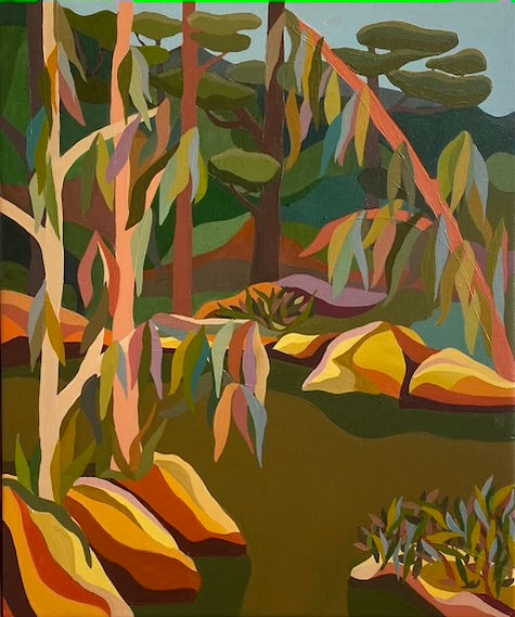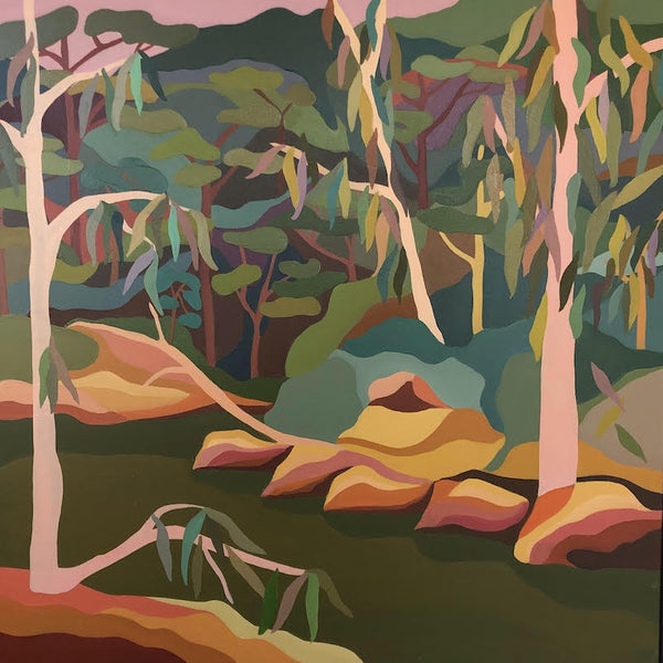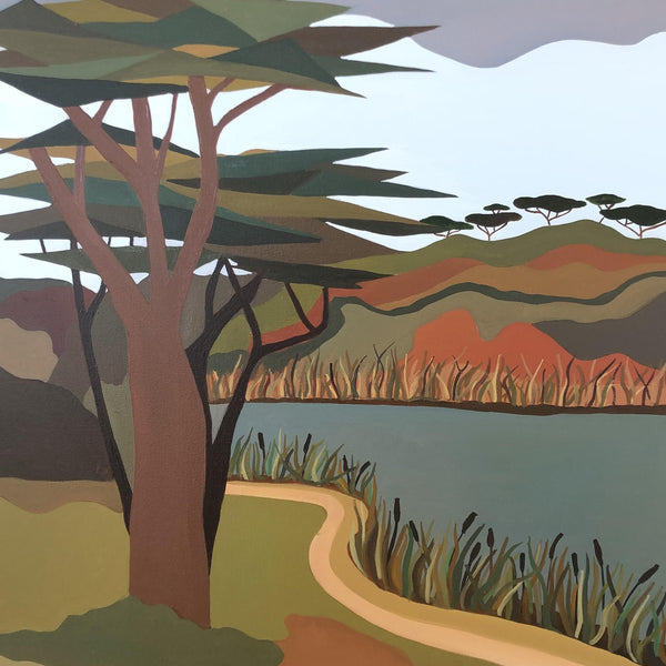 Kathryn's paintings are drawn from lived experience of a place with a hint of imagination. Influenced by the cubist movement and the way they reduced their subjects to geometric forms, Colour palettes are arrived by saturating hints of colours found in nature. By combining these two approaches in tandem with strong graphic qualities and use of pattern, Kathryn's work straddles abstraction and representational approaches to painting.