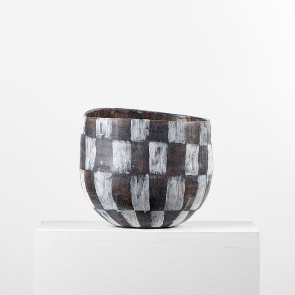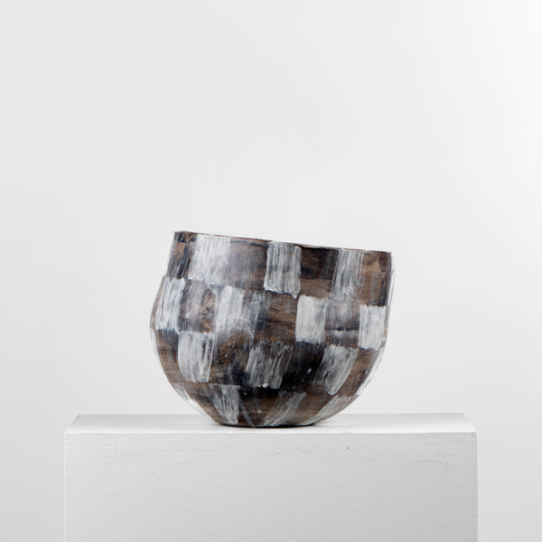 Lauren’s works are built by hand, using the coiling technique and they are fired in a kiln at a temperature of 1080–1250°C. She is primarily concerned with exploring the form and surfaces of her objects through mark making and texture. She considers the relationship of her pieces in still life compositions and prefers to make simple forms and use a limited colour palette in order to explore form through lines, tone, shadow and pattern. The surfaces of her pieces are all hand painted and the act of mark making is a very slow and meditative process, with fluid marks applied in varying depths to create quiet shifts in the surface from gloss to matte. Lauren has recently begun to change the scale of her work by creating large scale ceramic sculptures constructed out of multiple pieces.