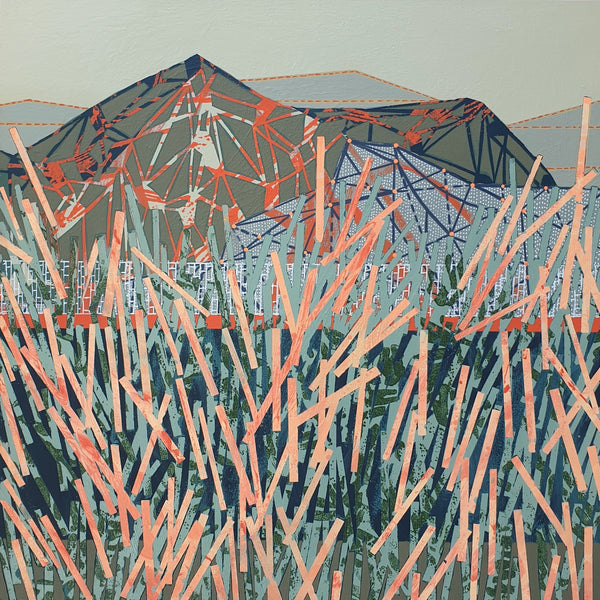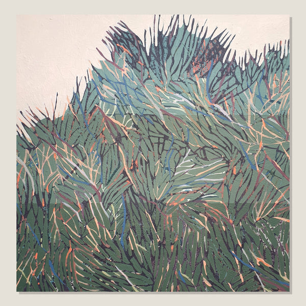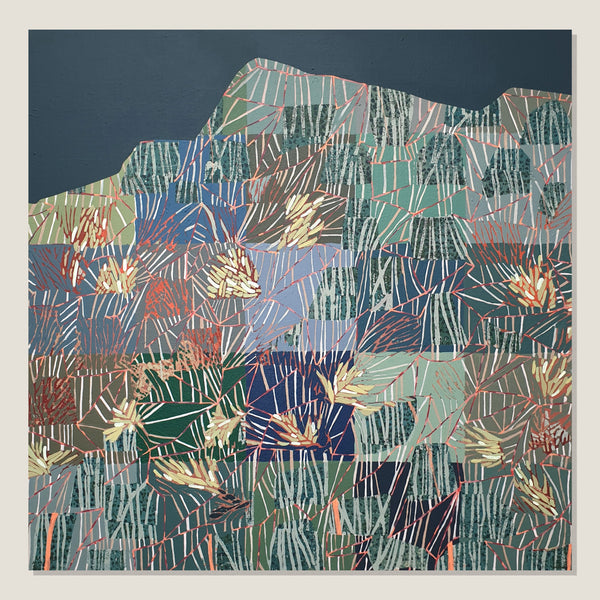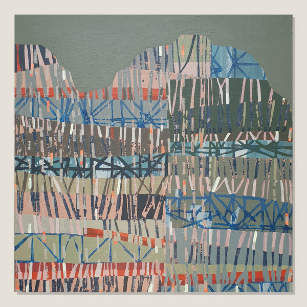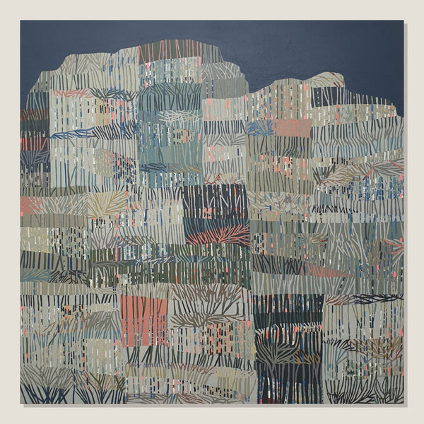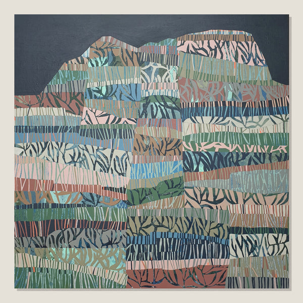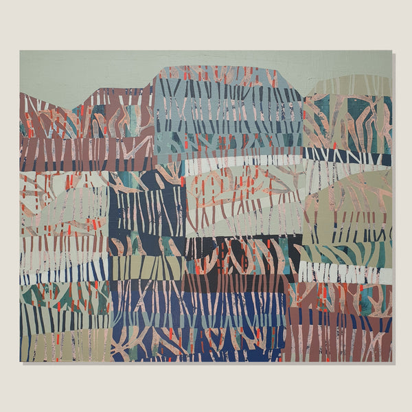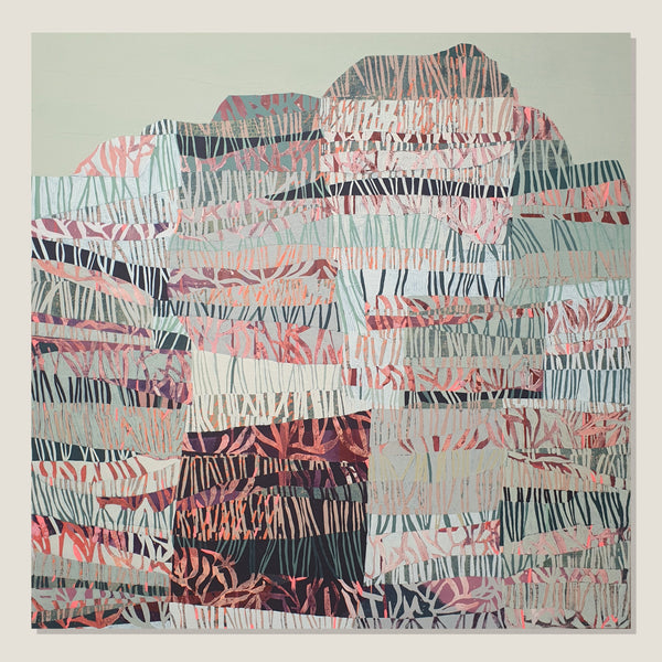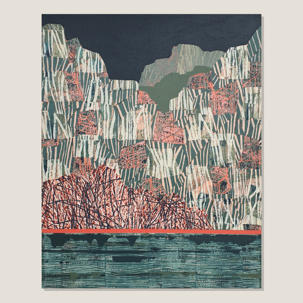 By combining a range of painting, masking and relief-printmaking techniques, Liz’s works explore layering, repetition, linework and pattern. This approach allows Liz to explore naturally occurring repetition and pattern found in the landscapes, highlighting the parallels with her love of weaving, patchwork and collaged imagery. Liz has created her own visual language to represent these similarities, resulting in richly textured surfaces.