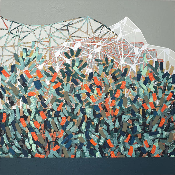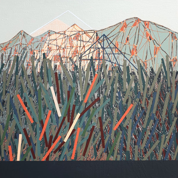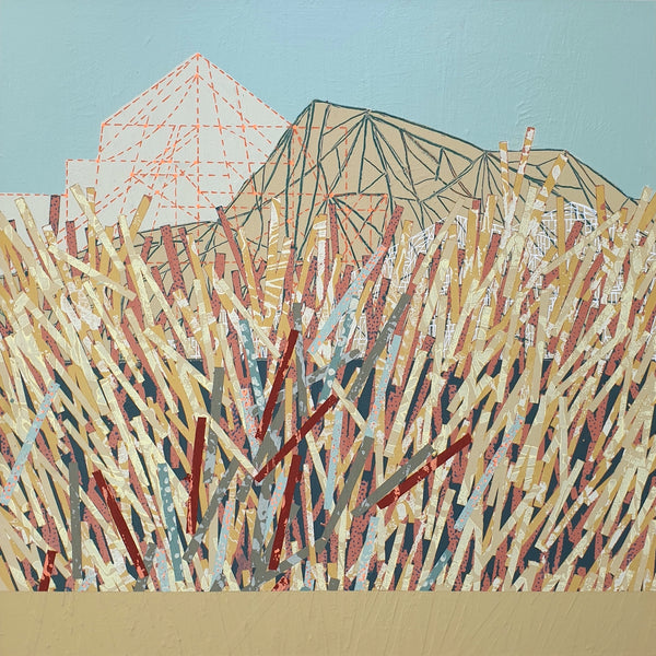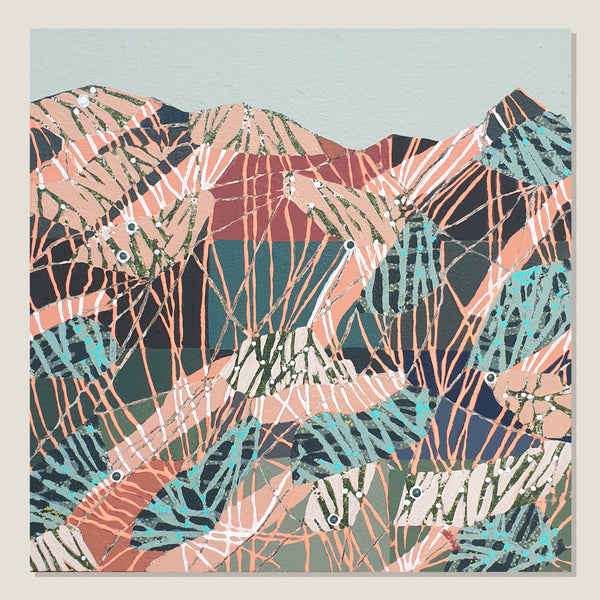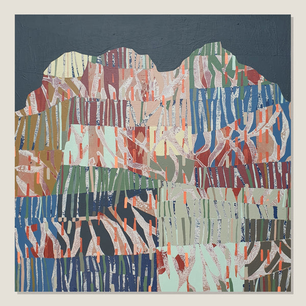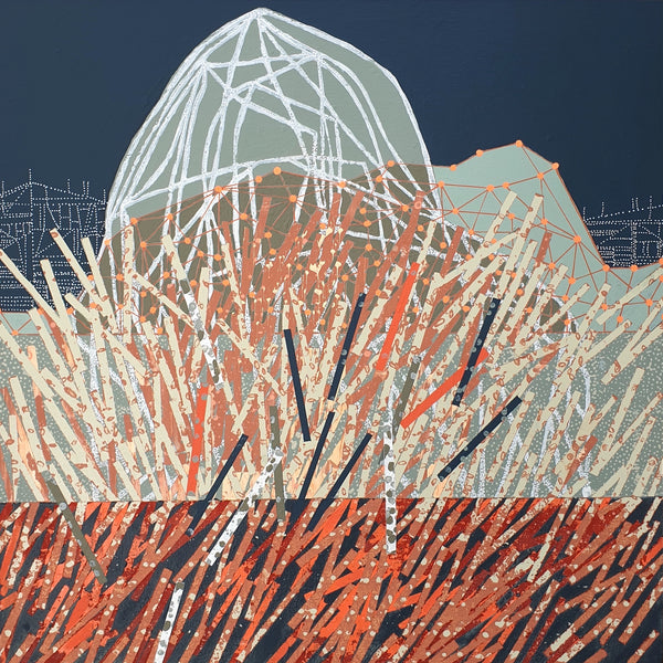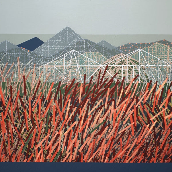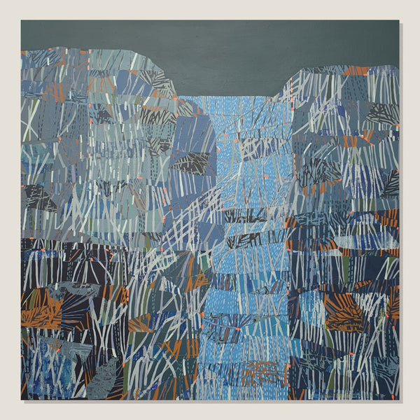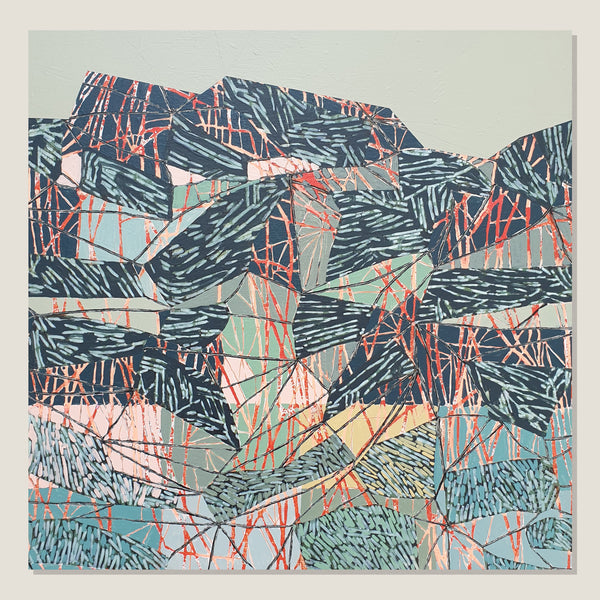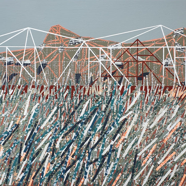 By combining a range of painting, masking and relief-printmaking techniques, Liz’s works explore layering, repetition, linework and pattern. This approach allows Liz to explore naturally occurring repetition and pattern found in the landscapes, highlighting the parallels with her love of weaving, patchwork and collaged imagery. Liz has created her own visual language to represent these similarities, resulting in richly textured surfaces.