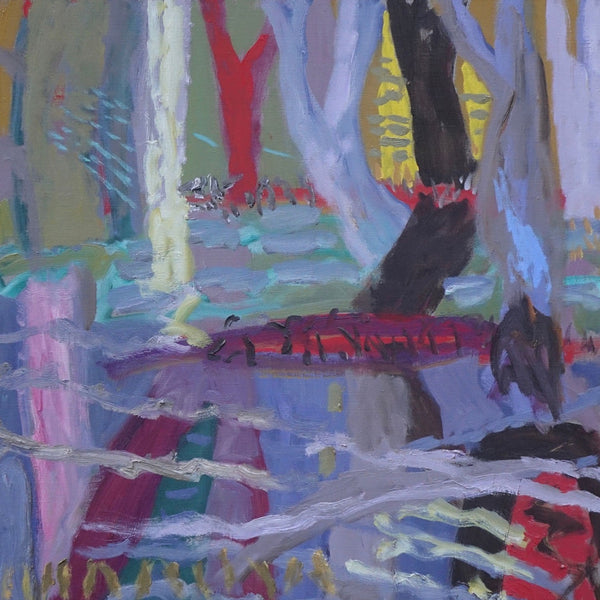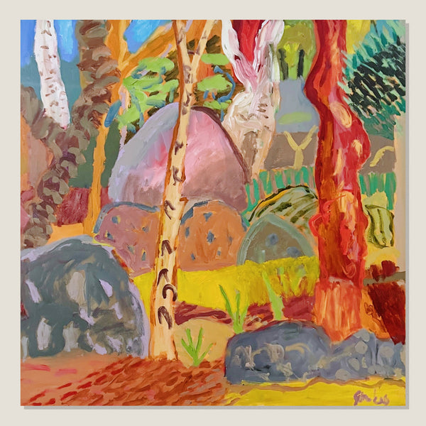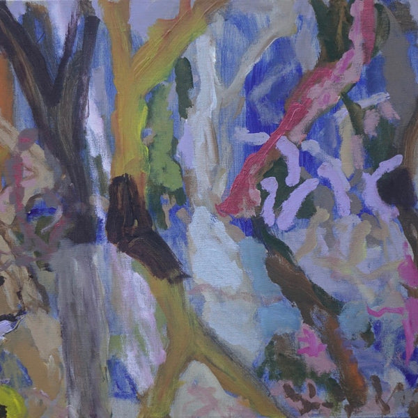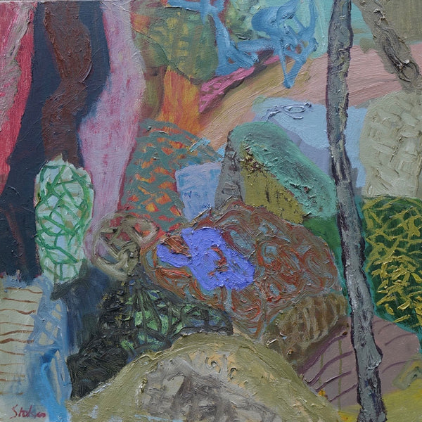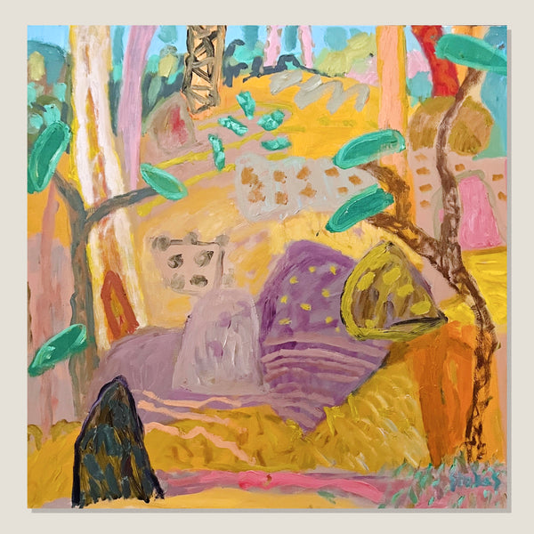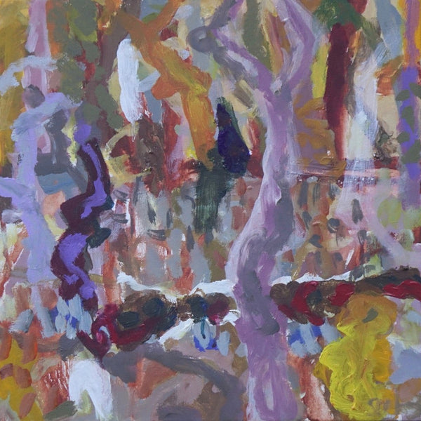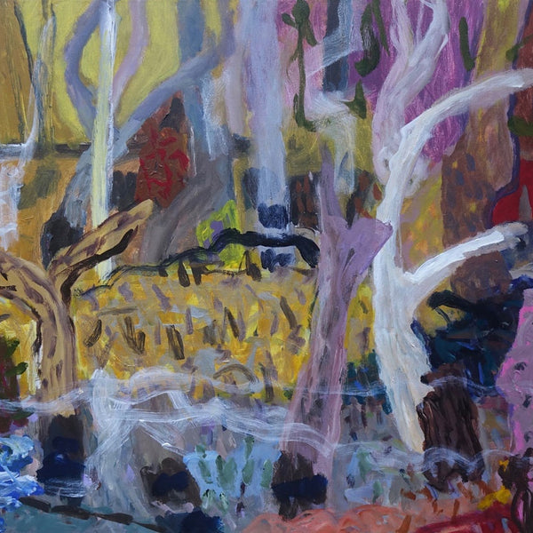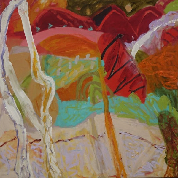 The energy of landscape is at the heart of the painting of Sally Stokes. That hint of mystery, the strange ecological relationships that nurture our sense of being human and our sense of transformation. This energy particularly comes from the Australian landscapes — the annual trips to the desert — drawing and absorbing this world — removed even from the internet — days on the river around the Hawkesbury and the incredibly diverse interrelationships of the Hawkesbury sandstone country’s complexity — more diverse than the Amazon acre to acre.