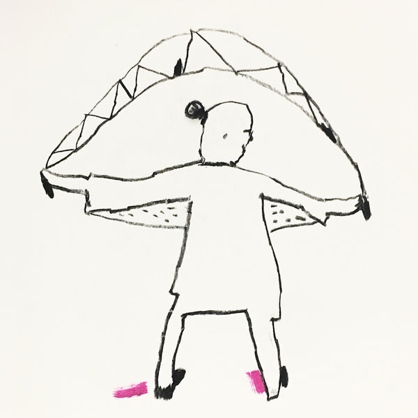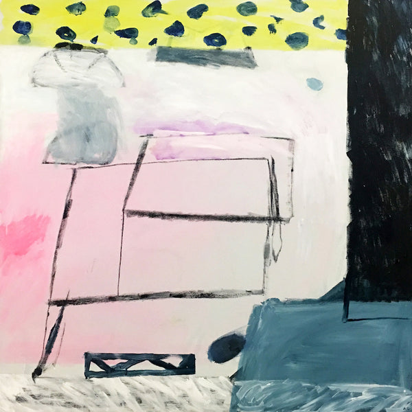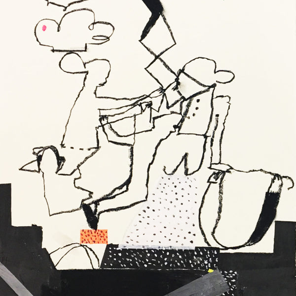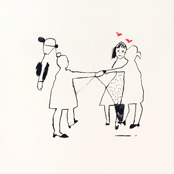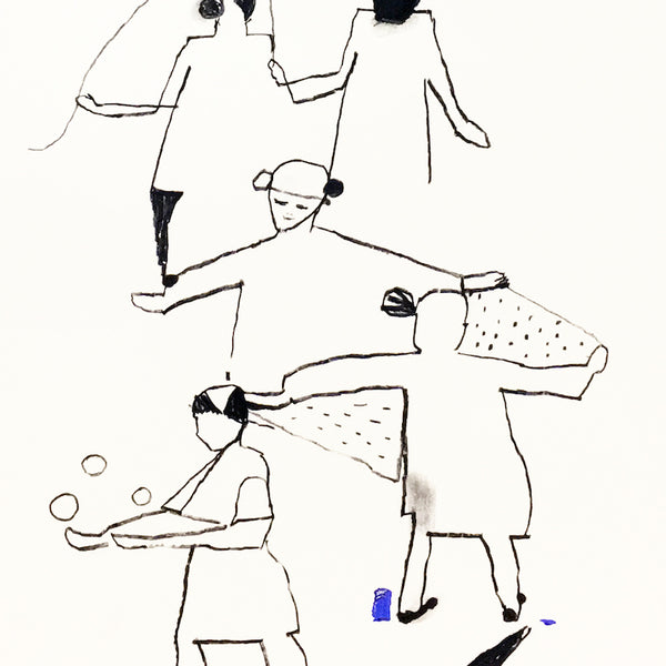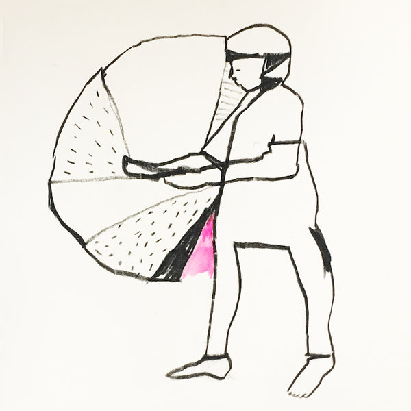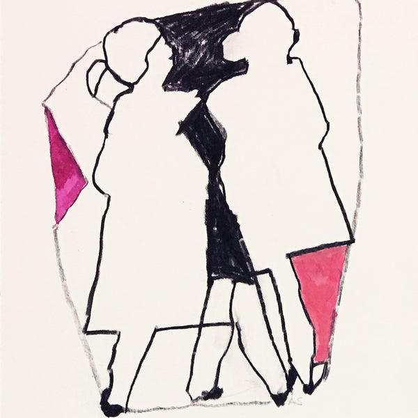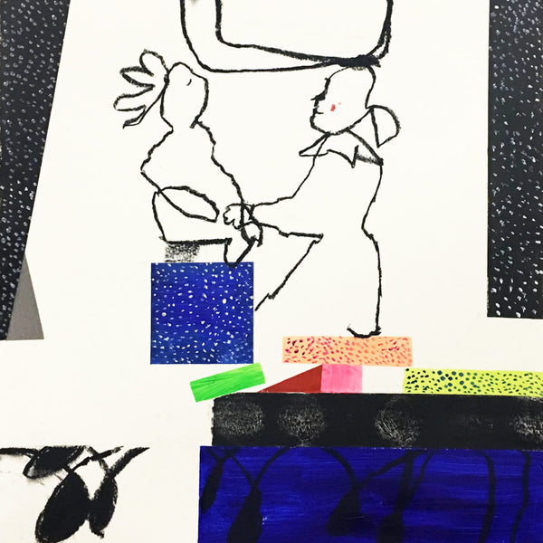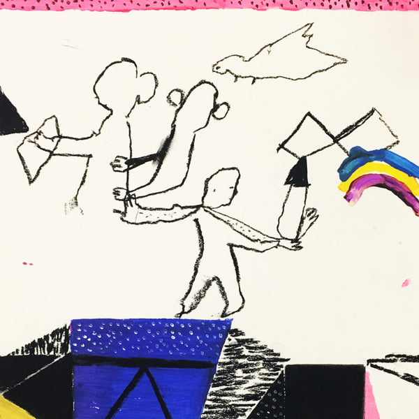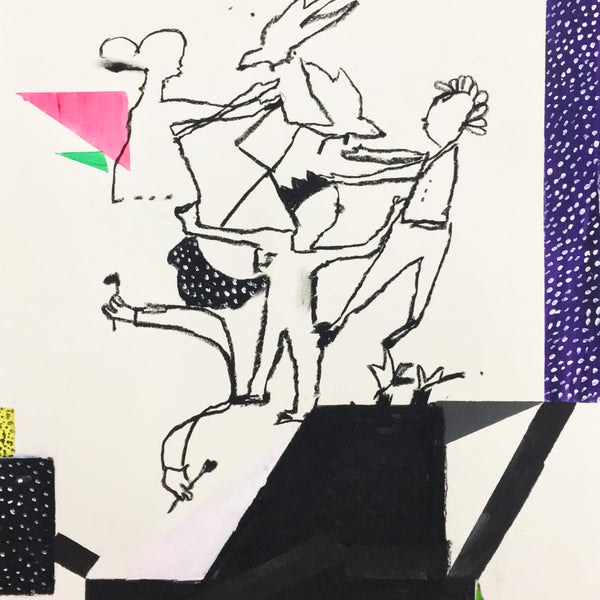 Where other mediums she adopts in her practice such as documented performance and video give a contemporary take on her ideas, drawing enables her to see her own hand in her work. In this group of drawings; colour, line and pattern are used in a playful way to help her create a space that resembles a stage or set where her figures interact, play a part, reveal who they are. Figures connect and collide as they share this space, highlighting the complexity of relationship dynamics.