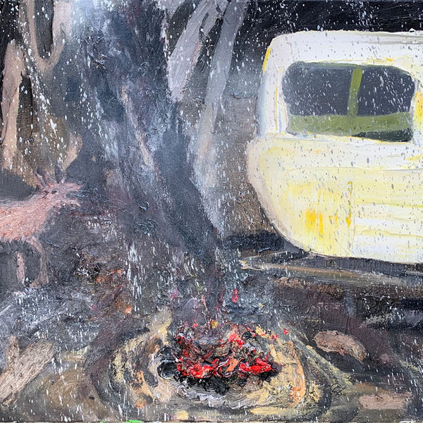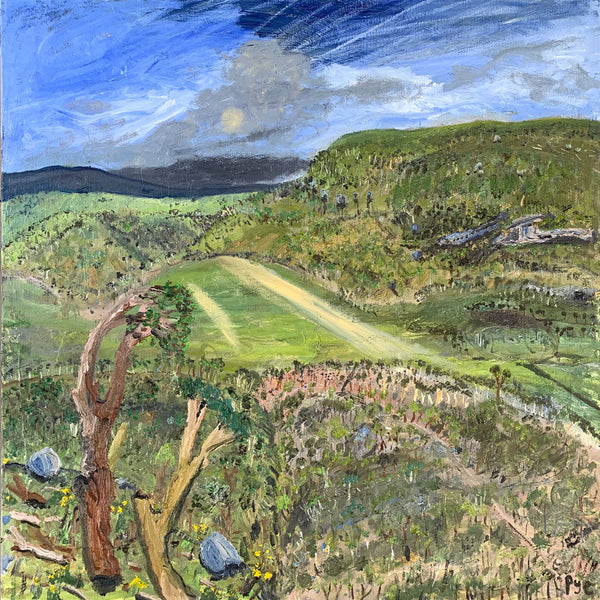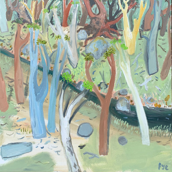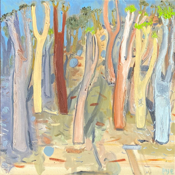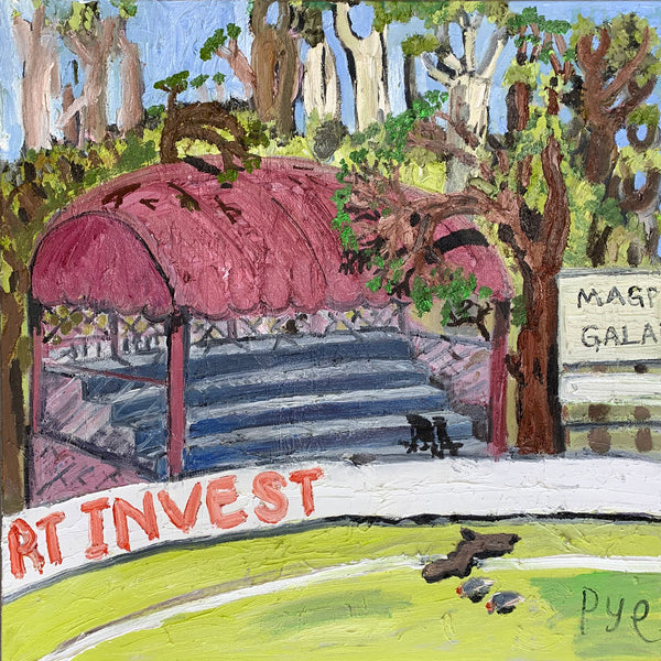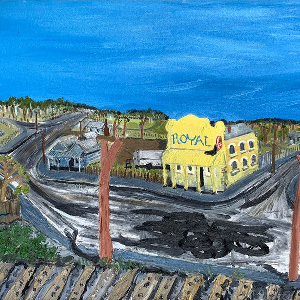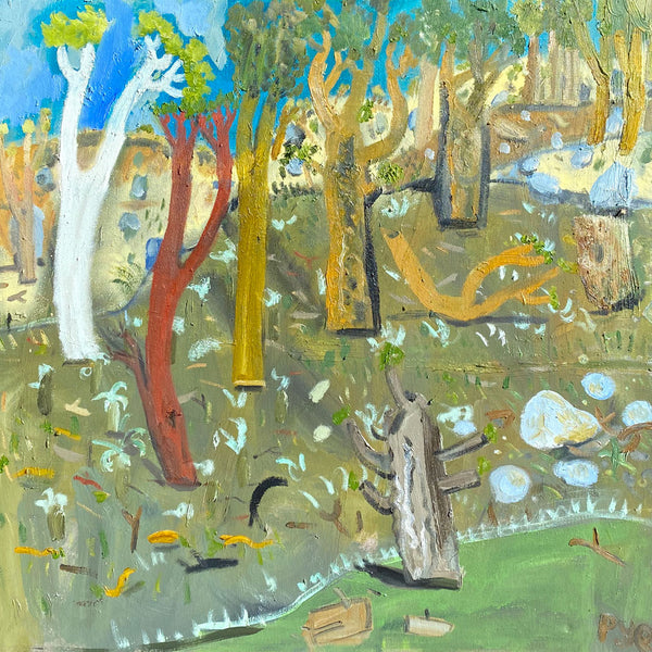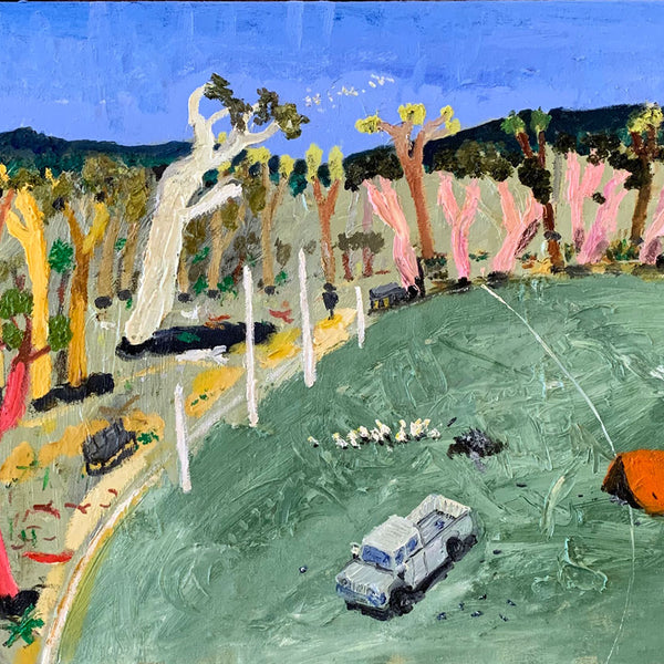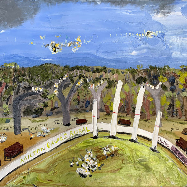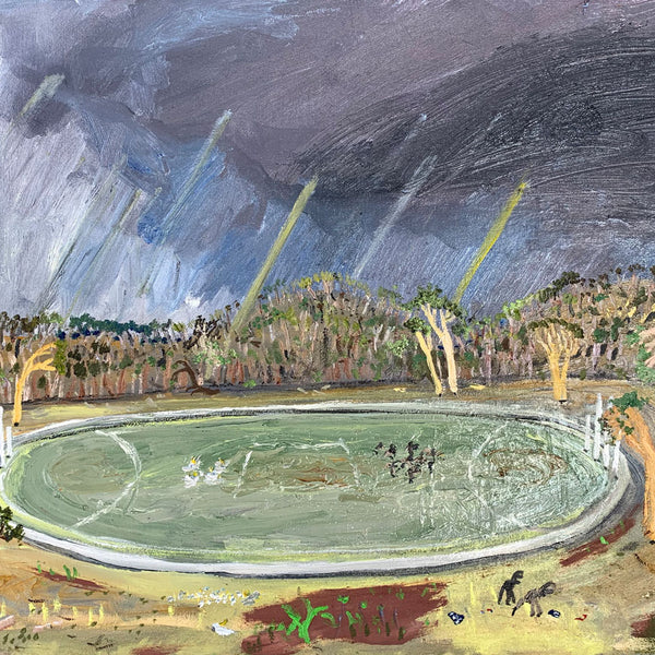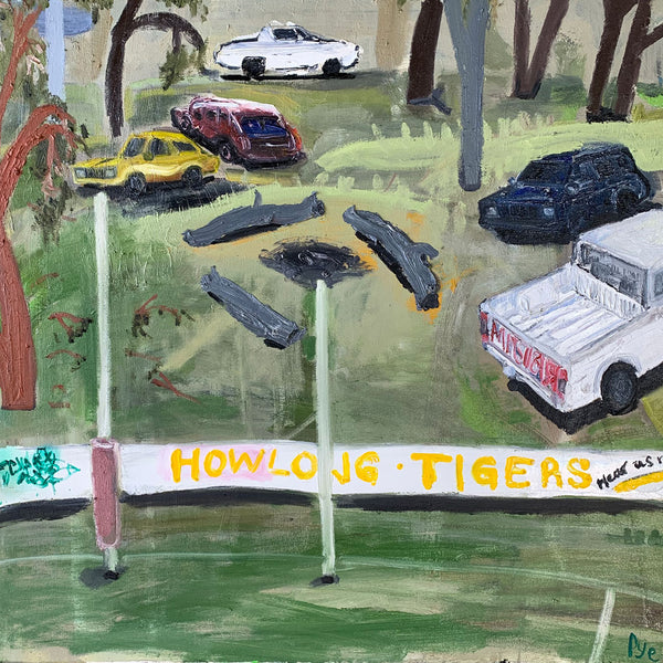 The footy oval is ubiquitous in these towns. it’s a shrine. This show catches the oval without the figurative form. In it’s dormant moments. Emptiness is expressed. Whilst none have figures as yet, it seems strange to capture human impact without the figure included. In this way, there’s a post-apocalyptic undertone in the works as the trees meet the urbana. But it is cantilevered by larrikinism throughout the body of work."