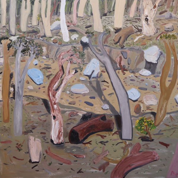 It's still about the Australian Bush. What continues to grab me is the awkward lines, the gnarly black lumps converted to bee hotels, the hollow logs converted to snake hotels, the soft ripples of the well satisfied river gums and the chaos of the bush floor arrangements.