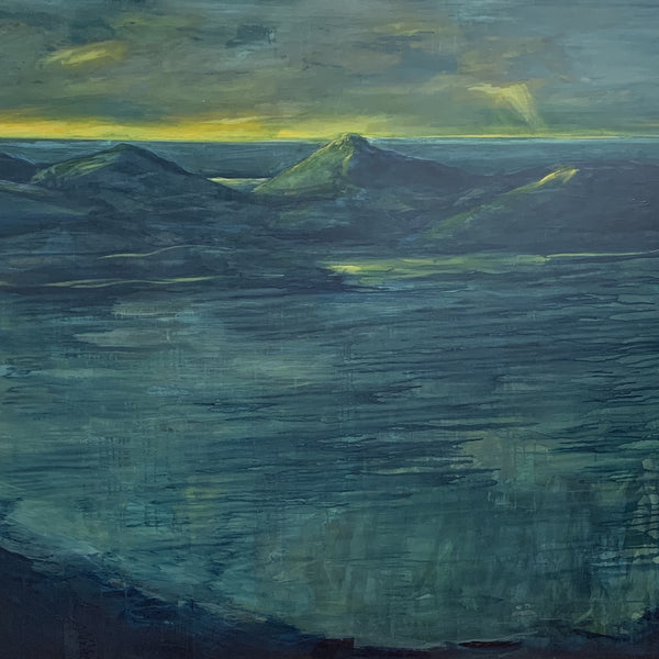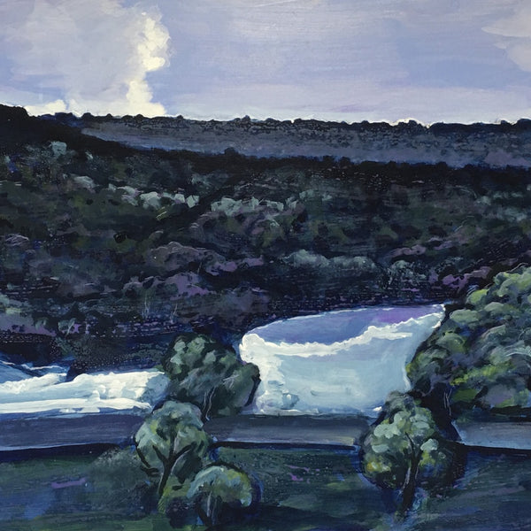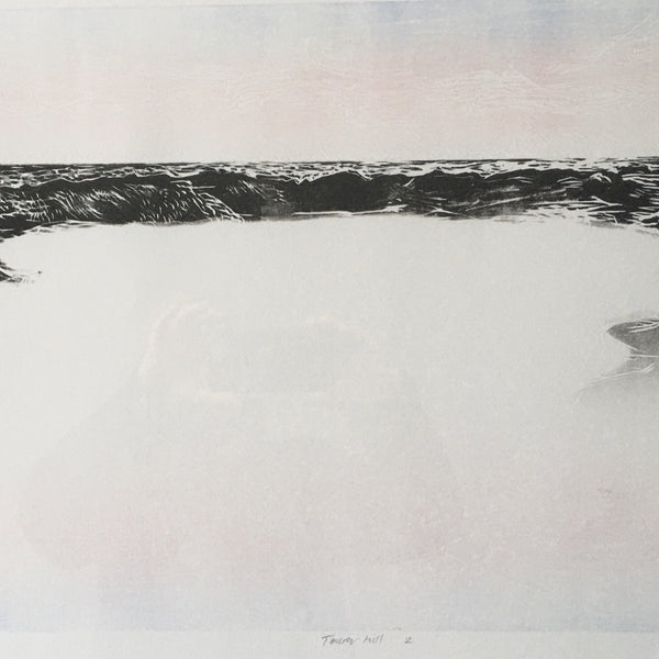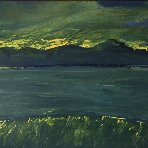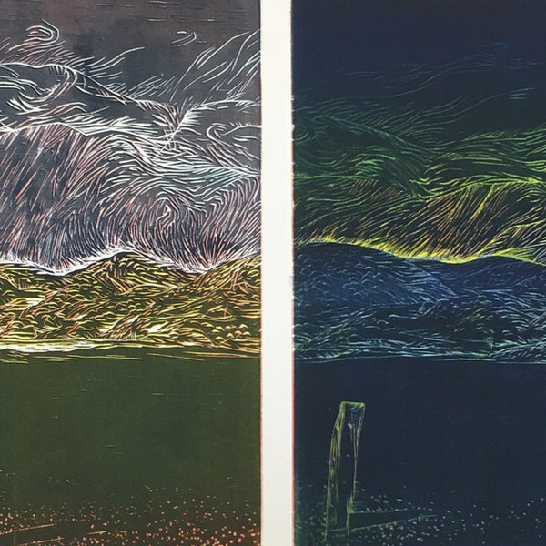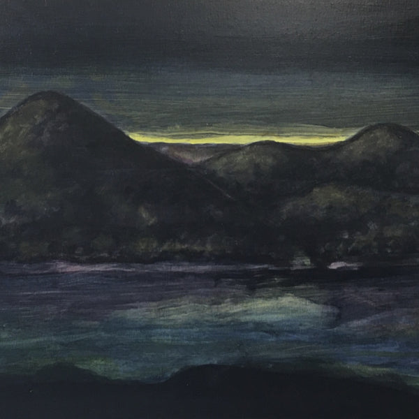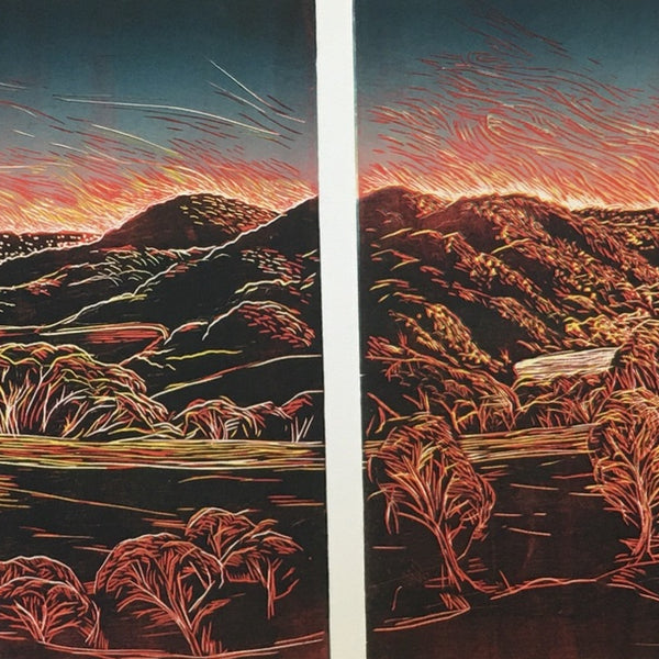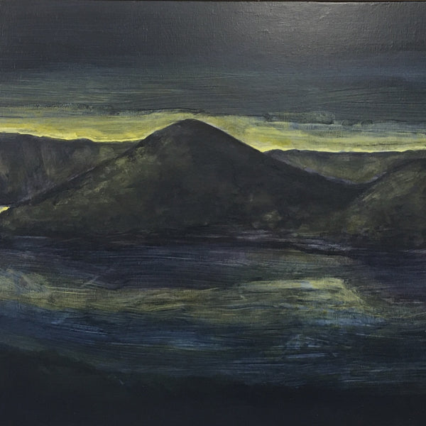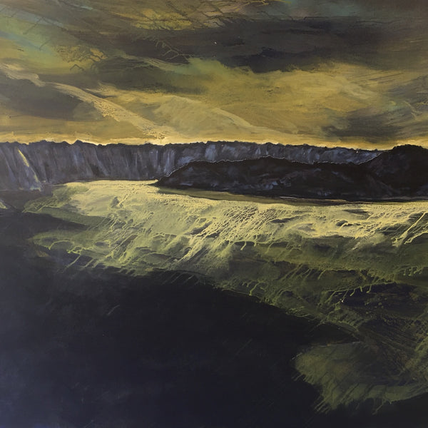 "For this exhibition of paintings and prints, I have focused on 360-degree views from the top of the crater of this dormant volcano, which is located on the lands of the Eastern Maar people. The vastness and beauty of Tower Hill is fascinating. It is such an awe-inspiring, ancient environment that changes constantly, depending on where you view it from and the weather conditions. The ever-changing influences of mist, light, wind and rain are dramatic and impact the landscape and the viewer’s psyche. Sublime visions can be had, as micro-systems of sunshine and squall flow through and over the caldera, rendering each aspect of the panorama differently. It conjures the mystique and heals the spirit."