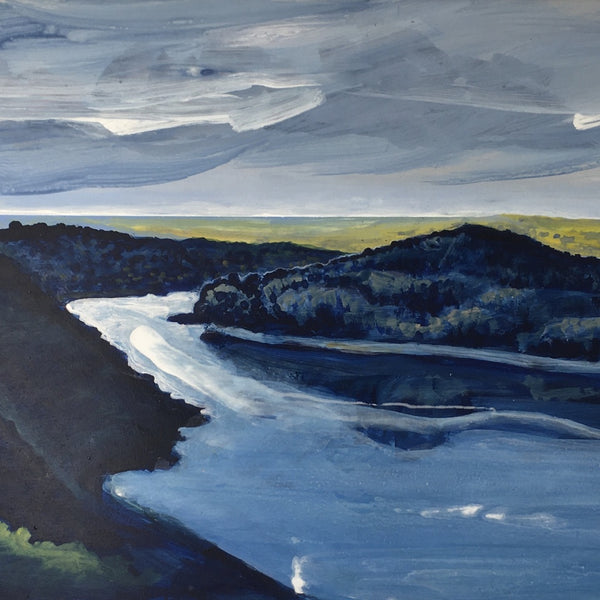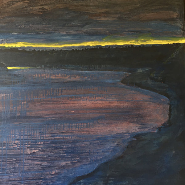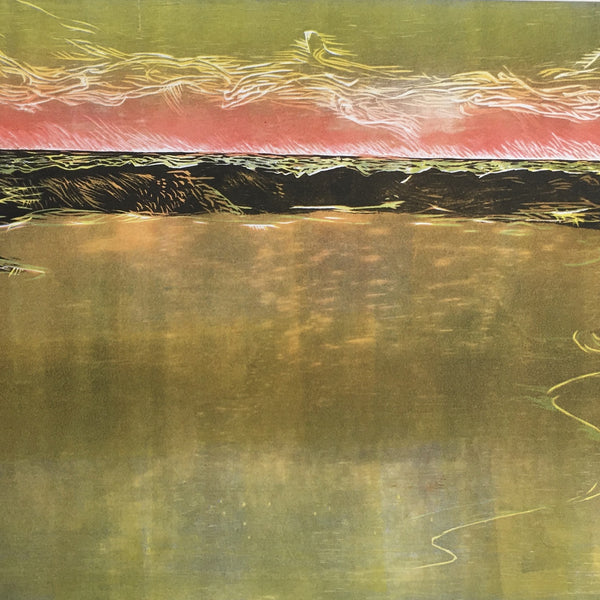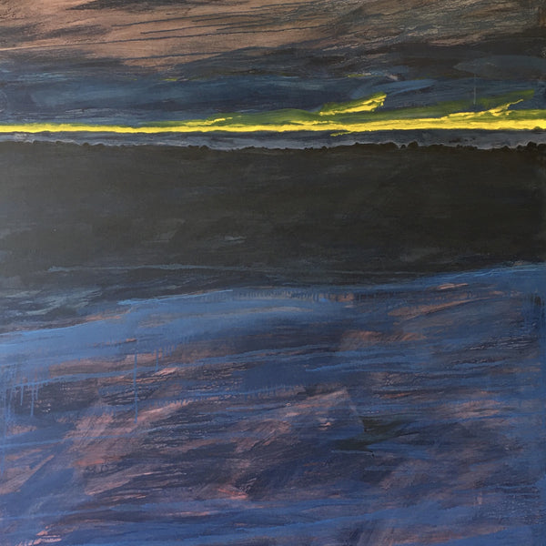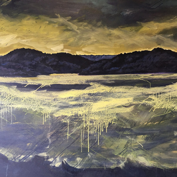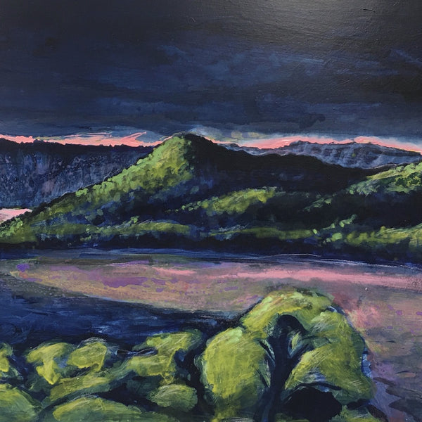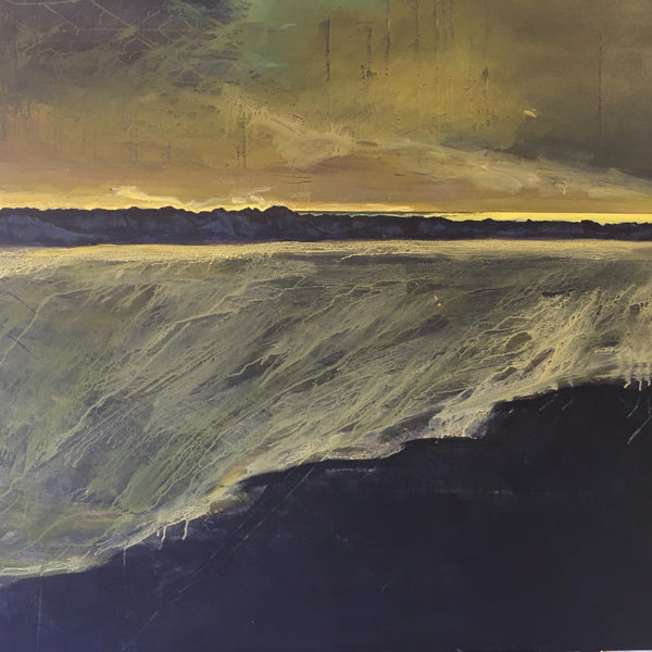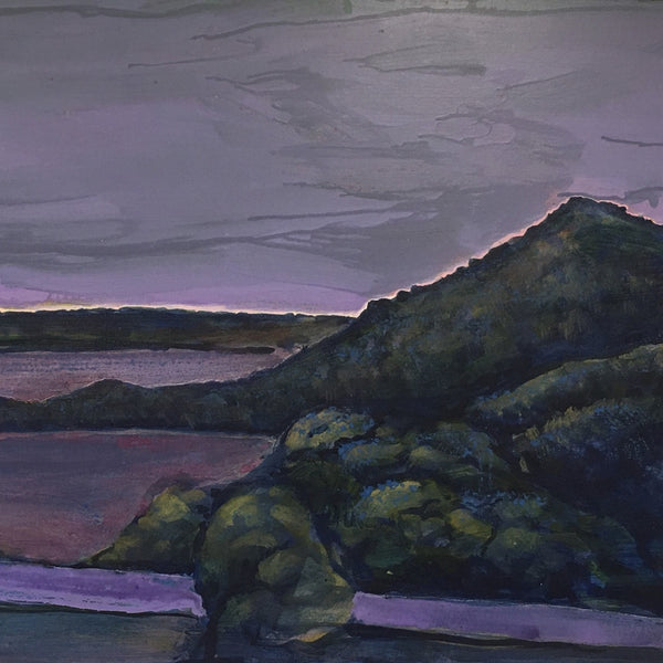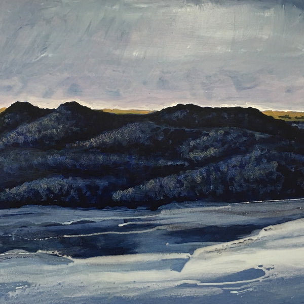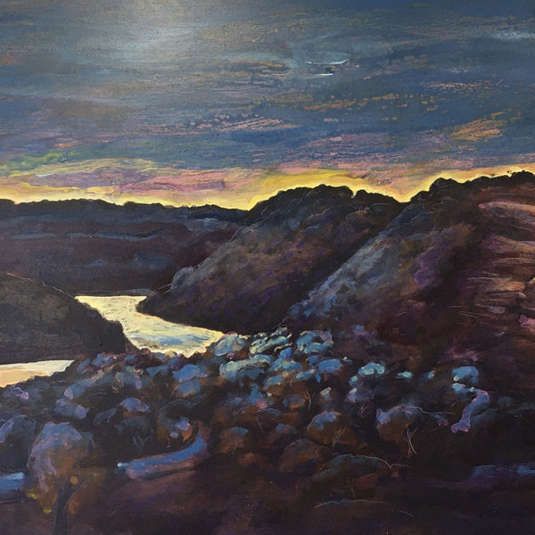 "For this exhibition of paintings and prints, I have focused on 360-degree views from the top of the crater of this dormant volcano, which is located on the lands of the Eastern Maar people. The vastness and beauty of Tower Hill is fascinating. It is such an awe-inspiring, ancient environment that changes constantly, depending on where you view it from and the weather conditions. The ever-changing influences of mist, light, wind and rain are dramatic and impact the landscape and the viewer’s psyche. Sublime visions can be had, as micro-systems of sunshine and squall flow through and over the caldera, rendering each aspect of the panorama differently. It conjures the mystique and heals the spirit."