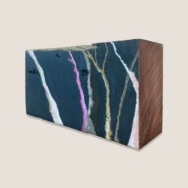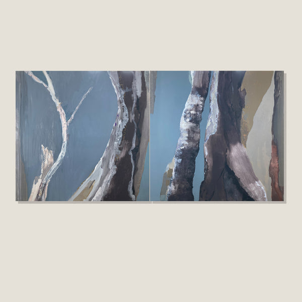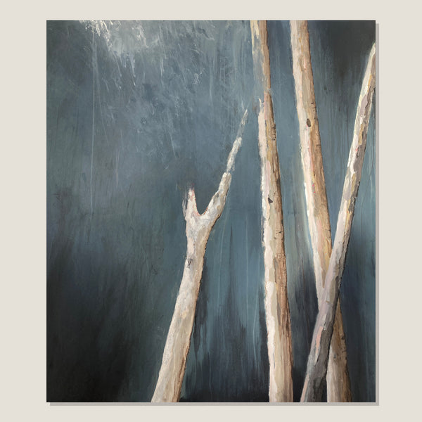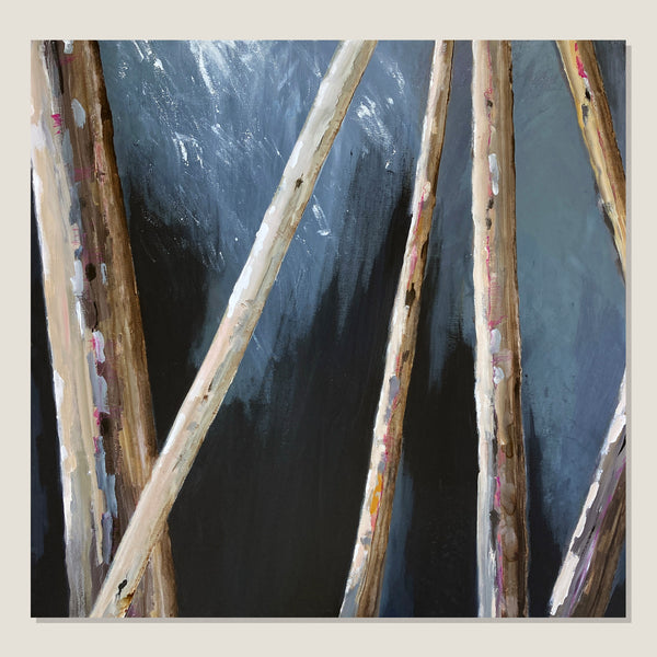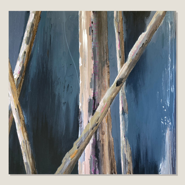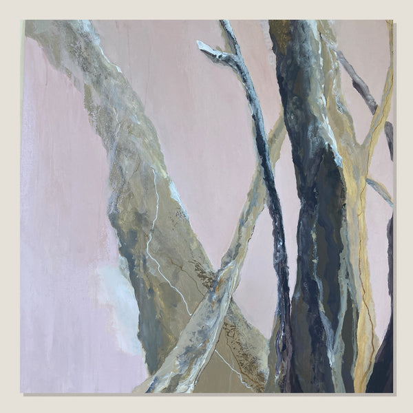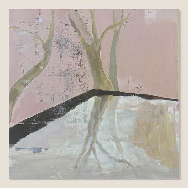 Back in the studio the paintings begin with a feeling and quiet contemplation of my visit with the trees to invite connection. My process starts with experimenting with colours and as my palette evolves, the shapes and structure of the pieces come forward. In the process of making this work I become passionate about the exact shade of dusty pink and grey-blue, and I find it more and more pleasurable to see the works coming together when the colours are just right. I don’t stop until each piece reflects the visual and emotional experience of my nature visits. I paint trees because I couldn’t live without them and this is my way of honouring them for giving us so much life and beauty."