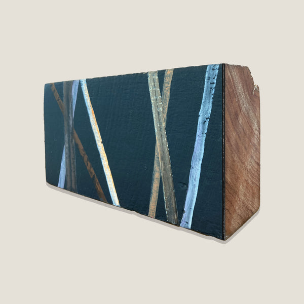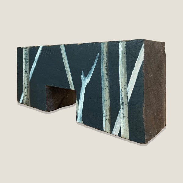 "The series, And The Trees Talked began with an urge to seek out tranquil pockets of native trees in regional Victoria. All my spare time was spent basking under the canopies and standing in awe of the magnificence of their height and grounding influence. My work takes direct inspiration from their generous shade, strong trunks and spindly branches. I observed insects and other creatures making their mark on the trunks and branches, weaving their own story and making it part of the tree’s powerful presence on our earth. Time spent with trees and in nature is an essential part of my process.