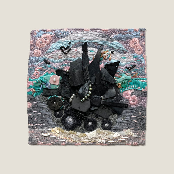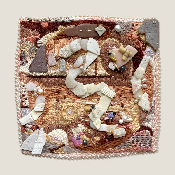 Inspired by the natural world, Regina’s work reflects spirit, colour, shape, form and texture, whilst exploring a balance between representative and imagined landscapes. Themes of femininity, consumption and grief are intertwined; with an intuitive pull towards embellishment and adornment these ‘jewels for a wall’ invite the viewer to pause, reflect and seek curiosity and connection.