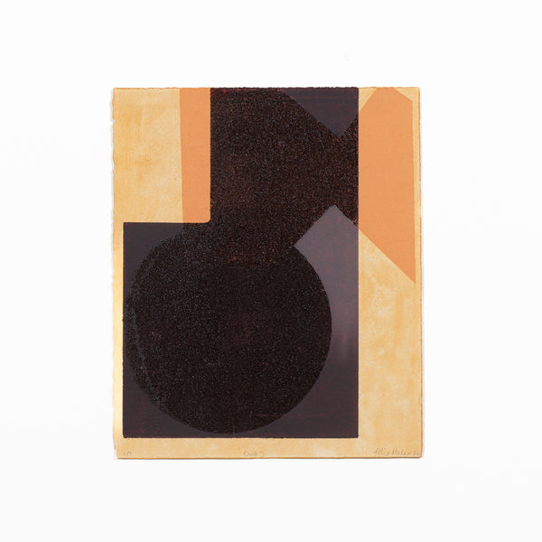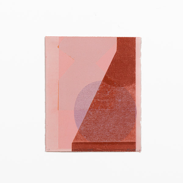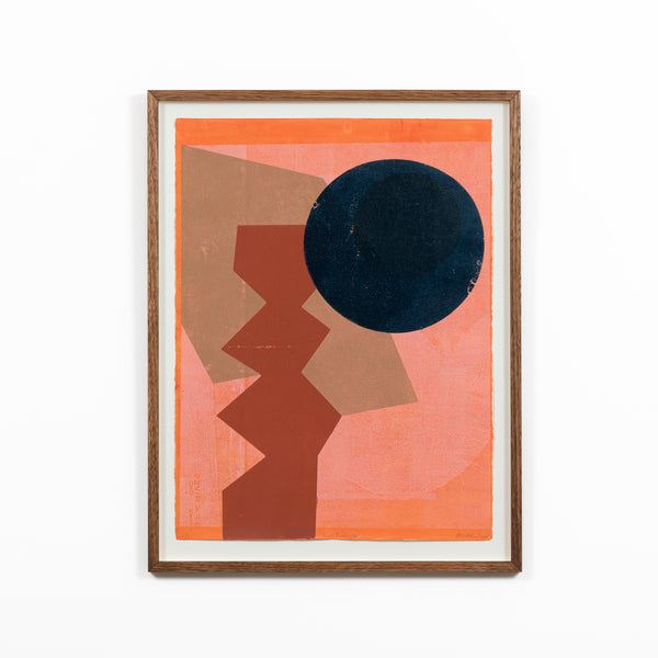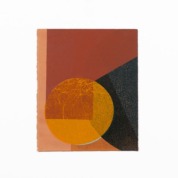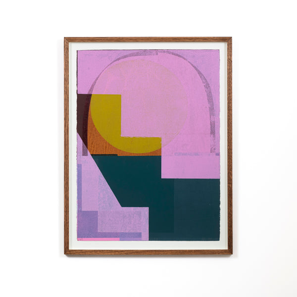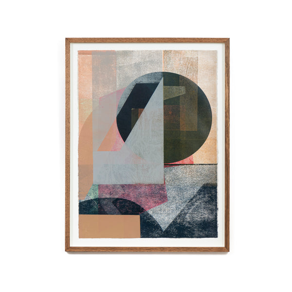 Ellie Malin's woodblock prints are a beautiful exploration of colour, form and texture. The playful layering of shapes is reminiscent of collage, whilst transparency in the different coloured inks emphasises the natural patterns of the woodgrain.