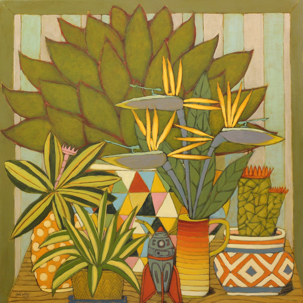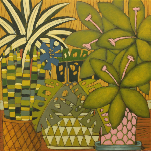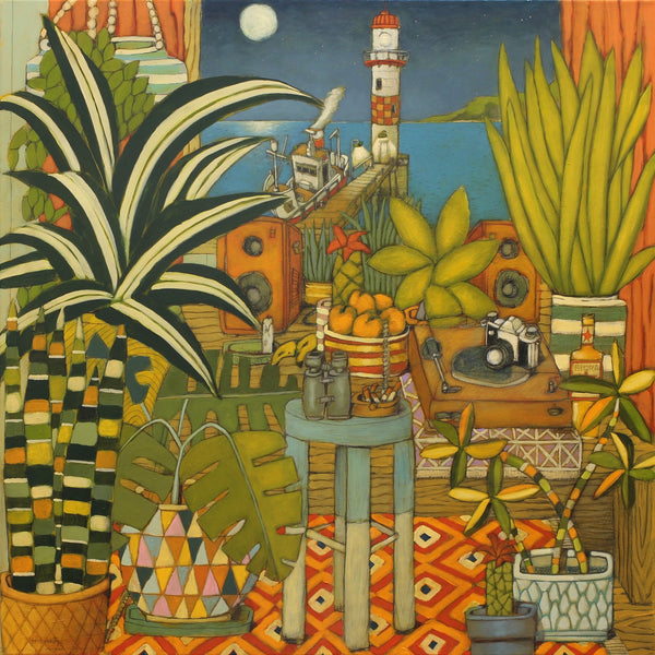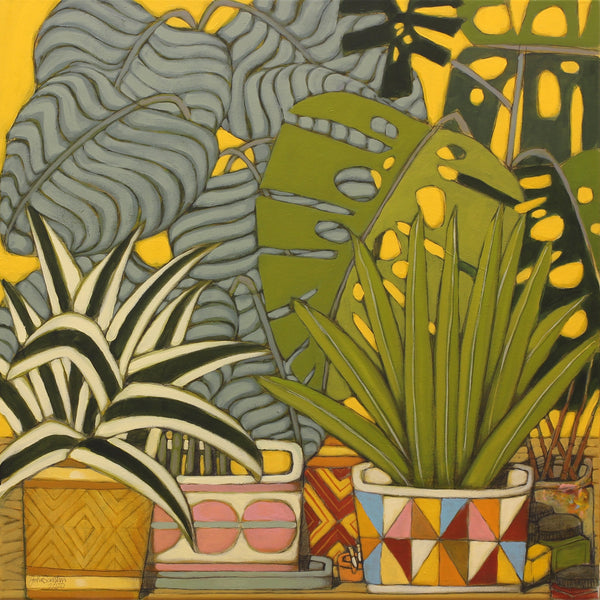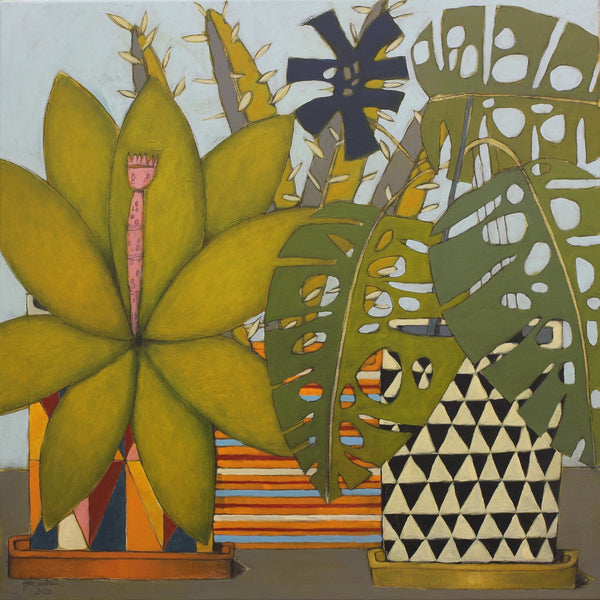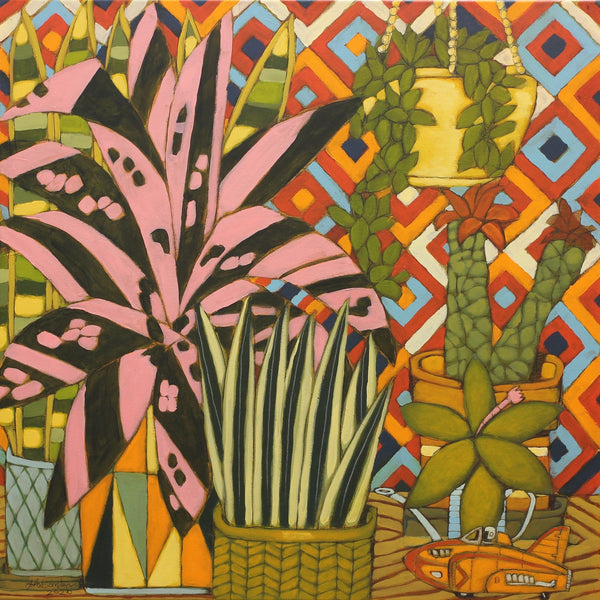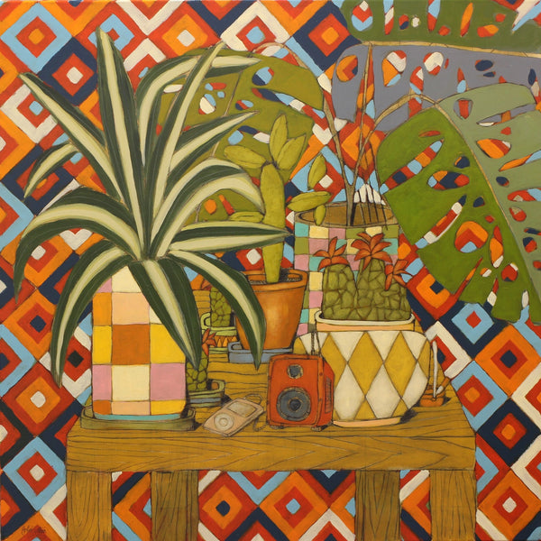 "The theme behind this new body of work is colour humour and hopefully optimism in a time when we need it more than ever. These pieces are of a whimsical nature which include retro toys, old cameras and music items from my own home. And of course the star of the show, a jungle of plants and botanical colour. Its hard living in a place like Byron Bay and not be influenced by the diversity of the flora and wild environment that surrounds me everyday. I wanted to go beyond the still life botanical work, and introduce a more personal story.