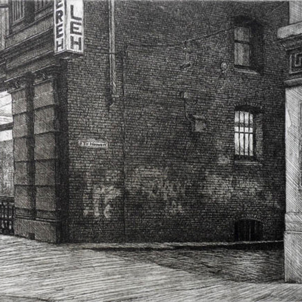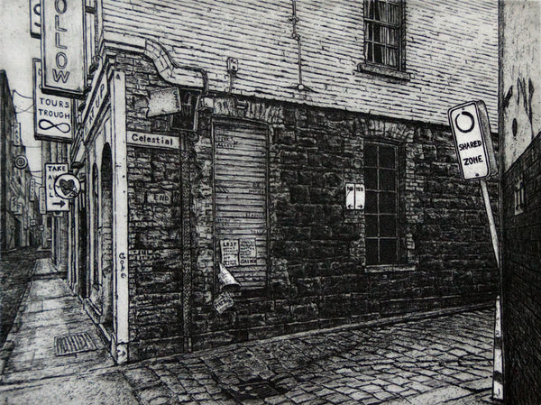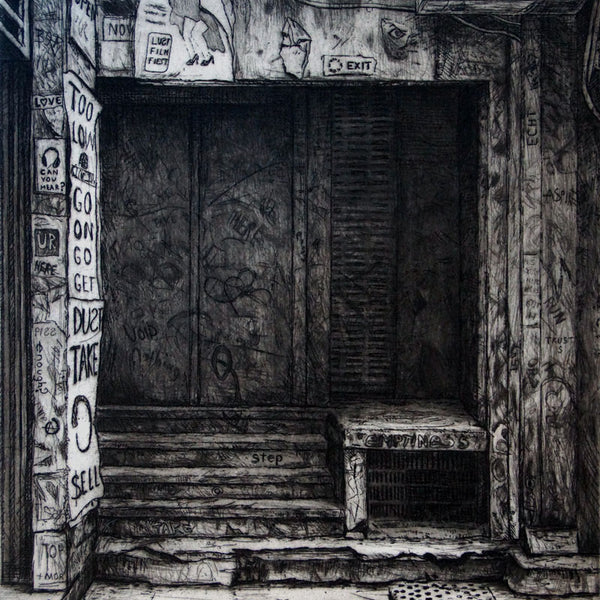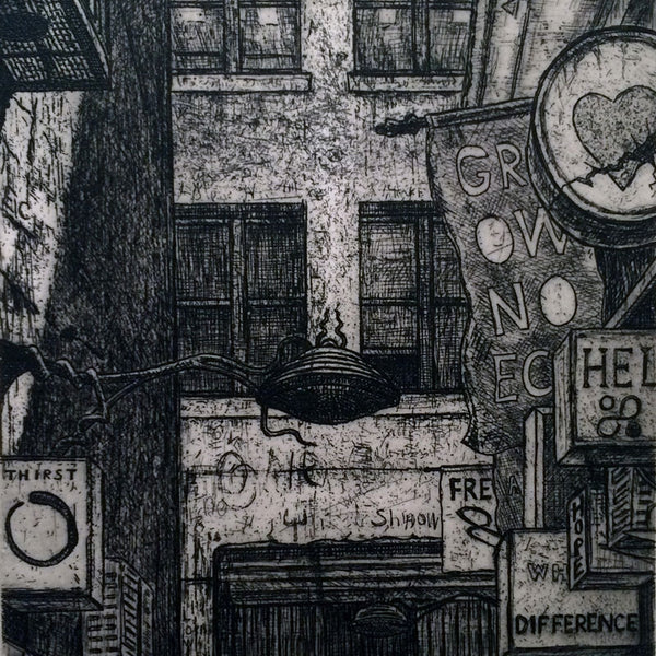 In the urban laneways, Wolter explores intimate and gritty spaces that also feel empty, mysterious and lonely. The textures, marks and recordings found on the faces of the buildings and walls of the subjects are analogous to the marks and gestures that are made on the copper plate by the artist. The textual messages present humorous and insightful ponderings on life and the hierarchy and ubiquity of graffiti and advertising. To the artist, the meaning and messages of these texts become interchangeable and equally as important or irrelevant to each other.