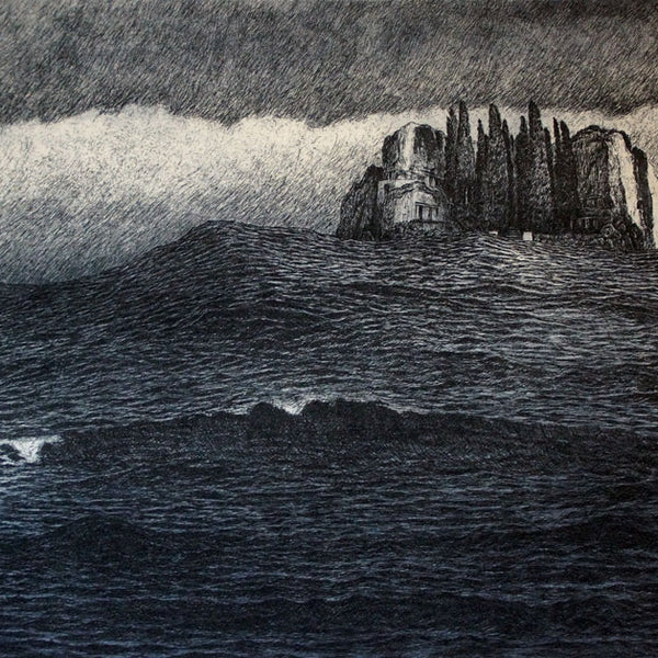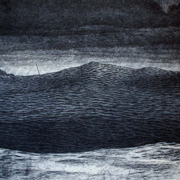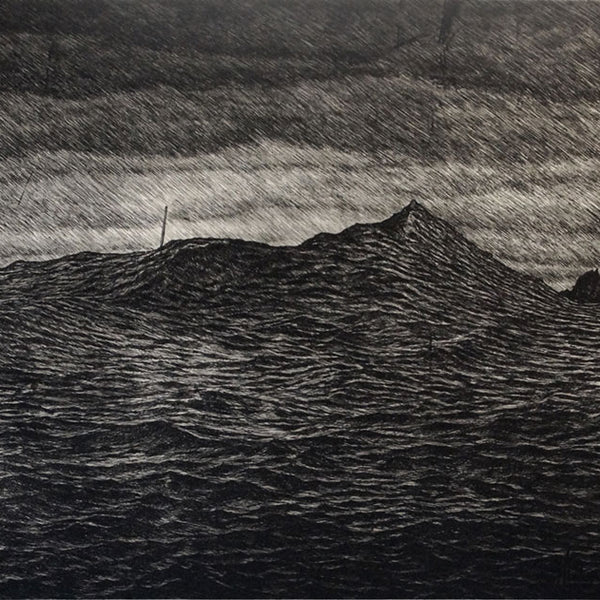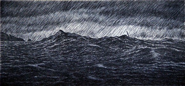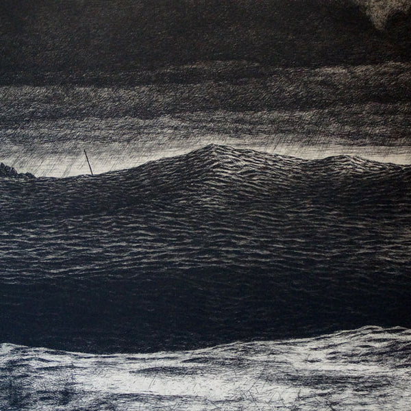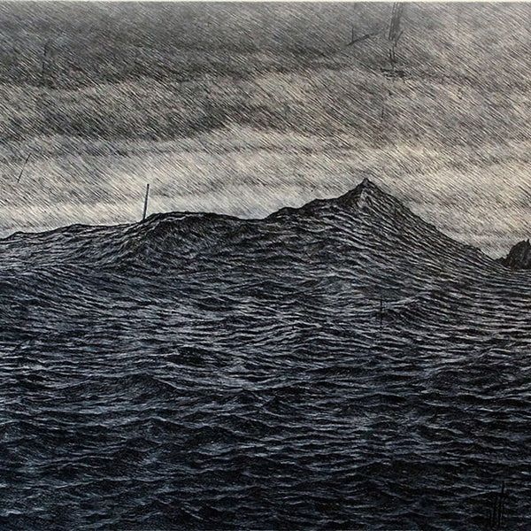 Peaks and Alleys features a selection of new and recent etchings that depict stormy swells and rising seas alongside some of Wolter’s characteristic urban laneways. The images explore humanities encounters with the natural world and the actions and consequences of these interactions. The Wave of Change series is an emotionally charged and evocative suite of recent etchings by Joel Wolter that presents to us forces of nature contrasted against, at times, small traces and remnants of humanity, as represented by a solitary mast traversing an unrelenting sea, or a haunting island set against rising seas and threatening skies. Initially these images evoke an elusive and mysterious feeling and aesthetic, yet on further inspection they become familiar messages to us that resonate with the intimate changes and challenges we might face in our everyday lives. The waves in these images also rumble with the broader and more consequential changes that will affect the environment and our lives in the not too distant future, such as climate change.