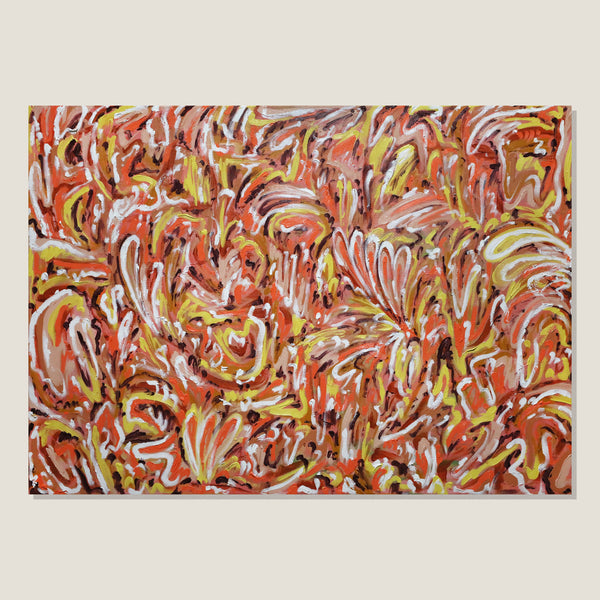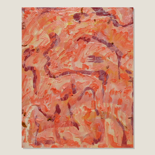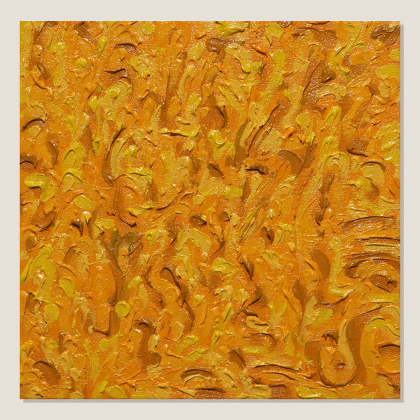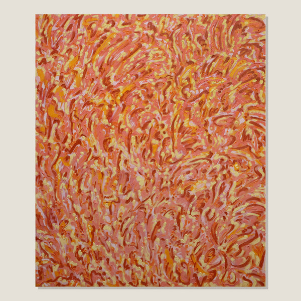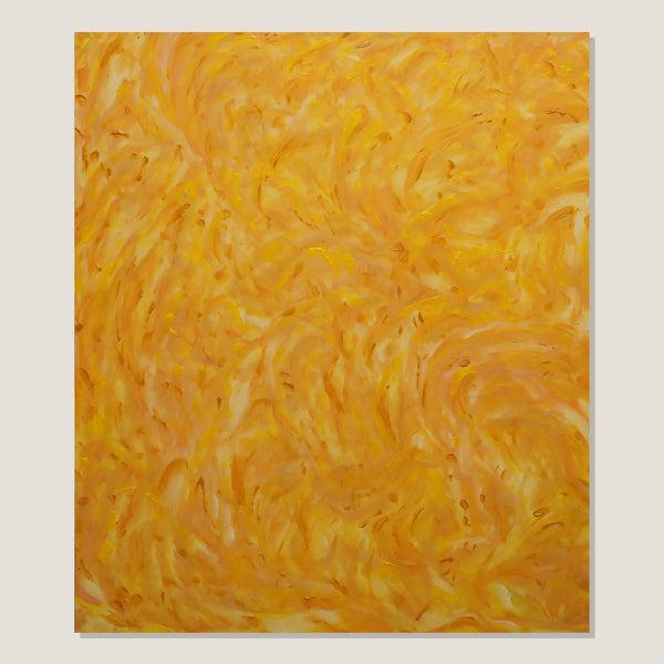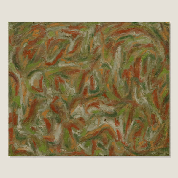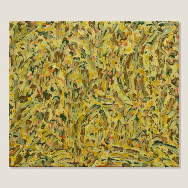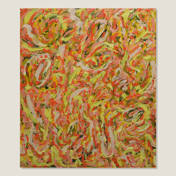 The Artist's psyche elicits colour, energy and texture. Feelings without words, restored through movements of the body in a performance of intuitive mark making. Recurring abstract shapes resemble motifs of plants and falling leaves, colours merge and melt into a harmonious familiarity. A mutuality between artist and artwork renders a polychromatic experience of manipulated spaces, and this gestural application of oil paint brings the artwork to life.