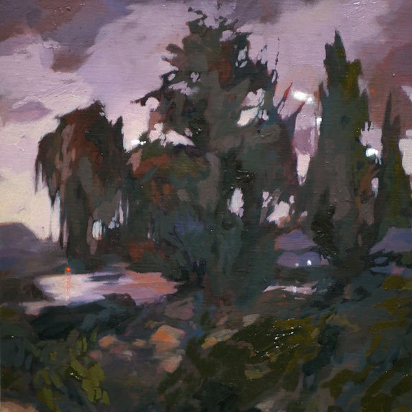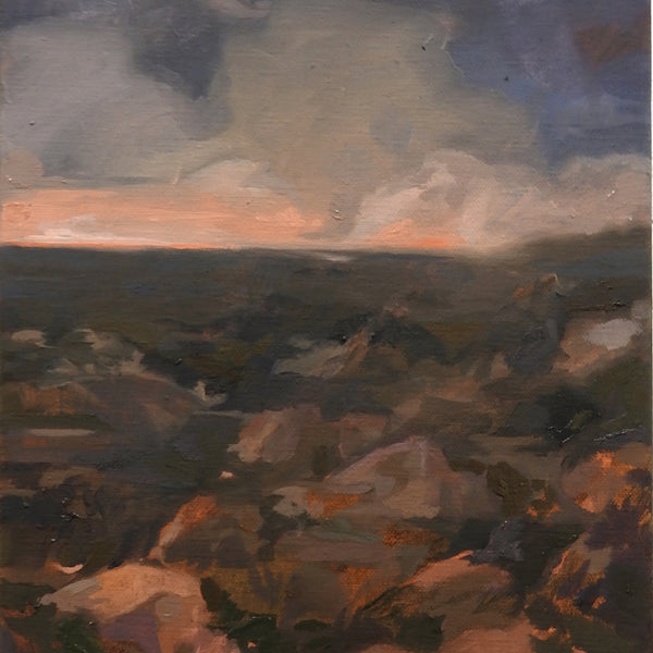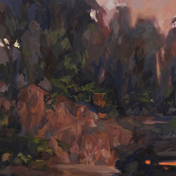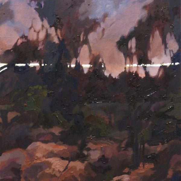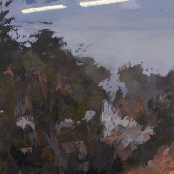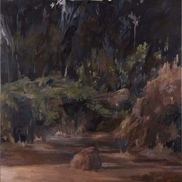 'The limitation of memory is observed in these works, natural exaggeration and disintegration of experience evident in each scene. The composition and atmosphere changes with each return to the canvas, building layers of conflicting memory and paint. The paintings in this exhibition were all formed from experiences on the traditional lands of the Gunditjmara and Girrai Wurrung peoples. The artist would like to acknowledge their Elders past, present and emerging.'