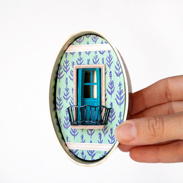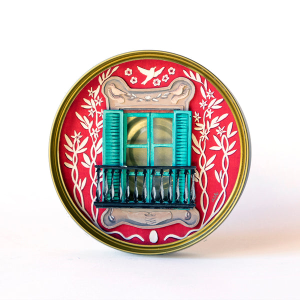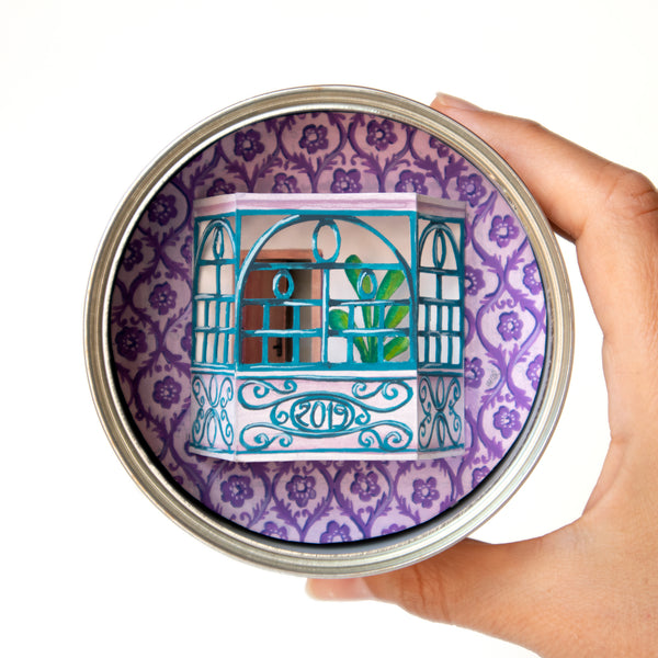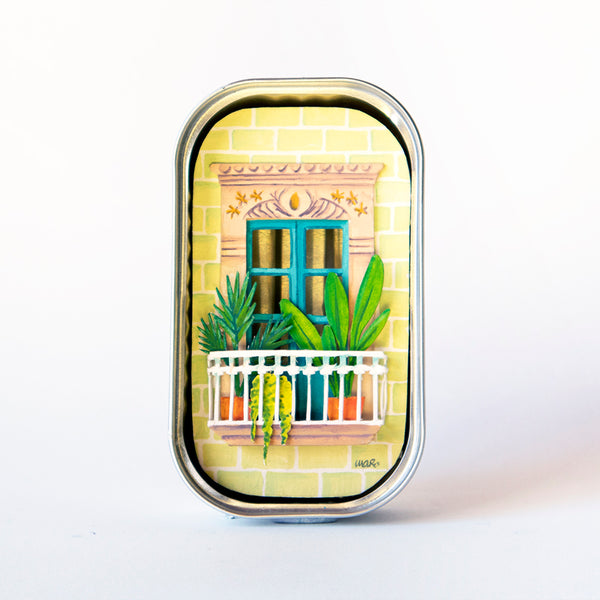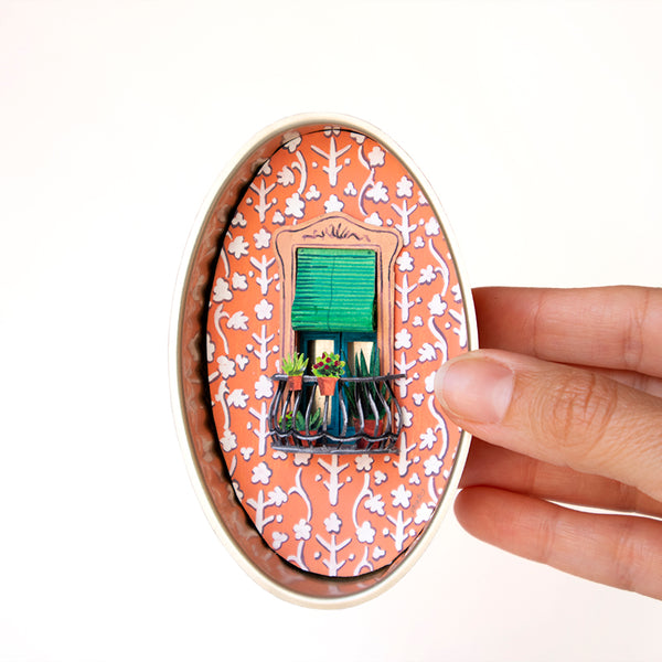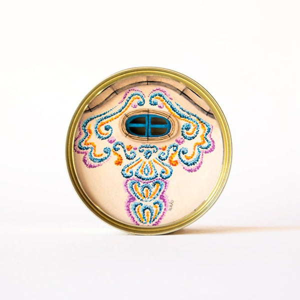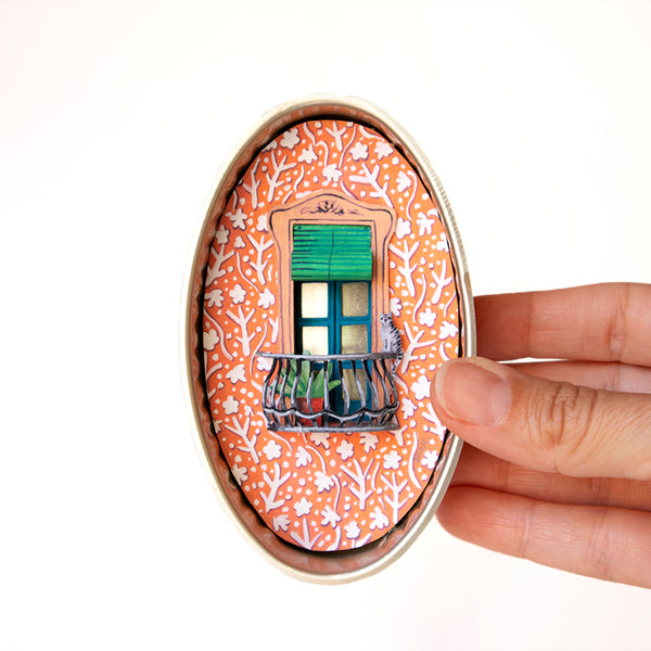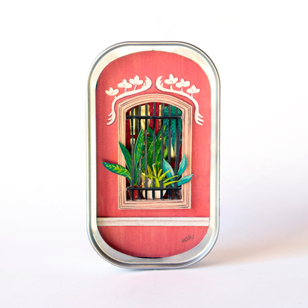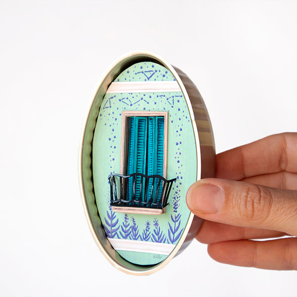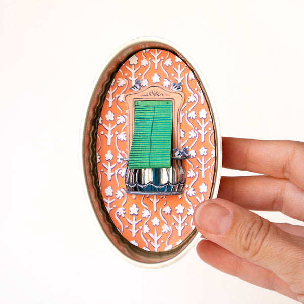 Using tins as a frame and working with paint and paper, Mar Delmar has created a series of 11 distinctly ‘Barcelonian’ scenes, in miniature. These works act as a kind of catharsis for the artist who has experienced substantial heartache in this city. She has embedded symbols of significance throughout the works, a visual language created to process her grief.