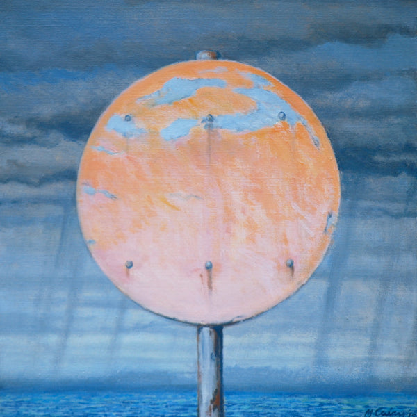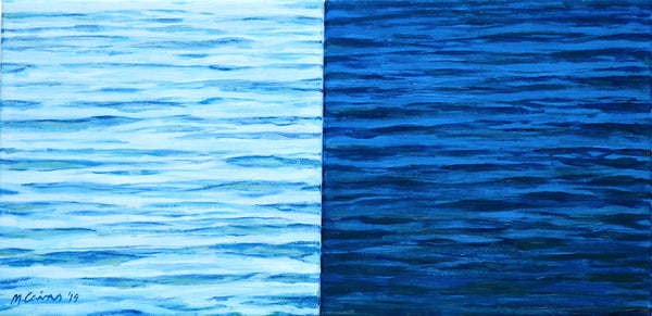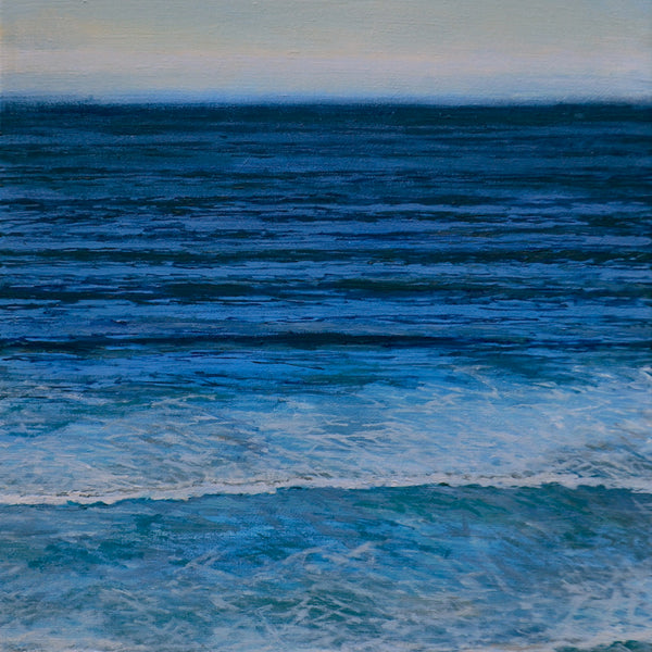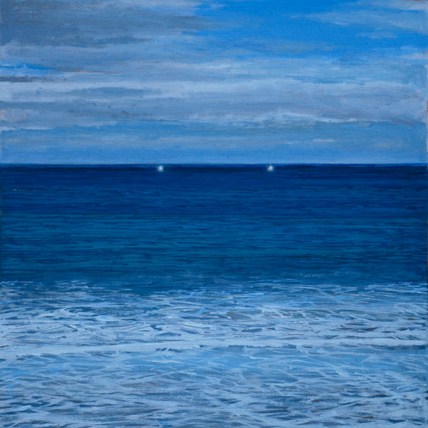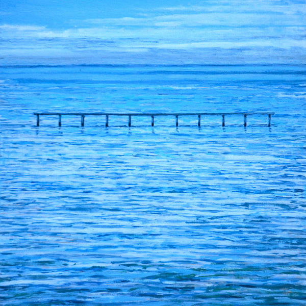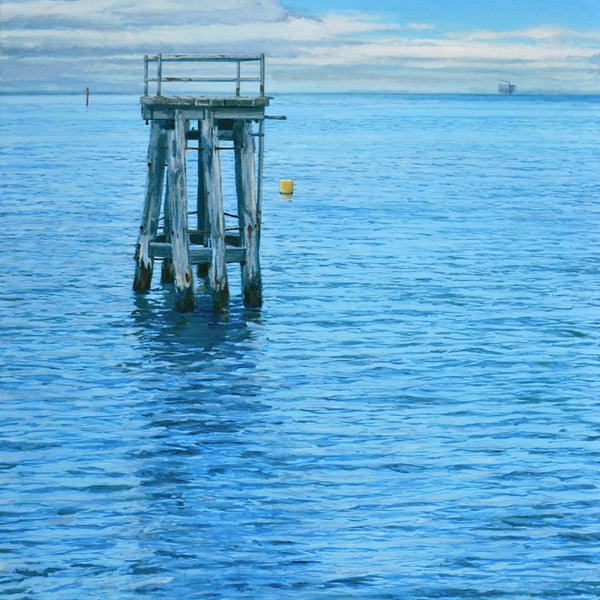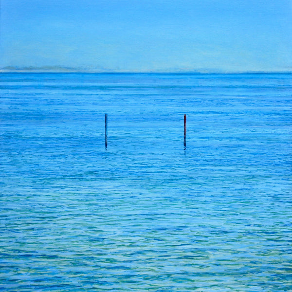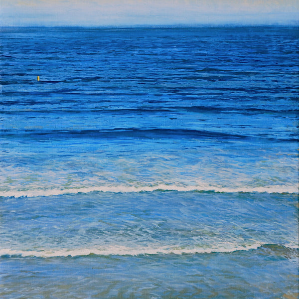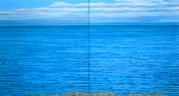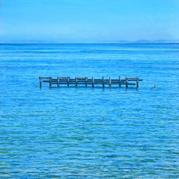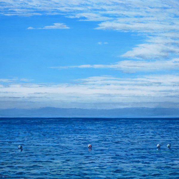 Mark Cairns has a natural affinity with the ocean. The horizon, a constant conceptual meditation nestled amongst cascading scales of blue. Cairns cleverly leads our gaze as we are drawn into direct contemplation of seascape occupied in unison with man-made constructs.