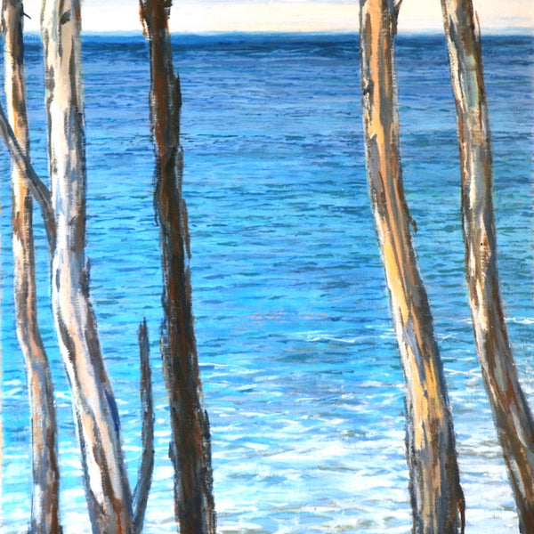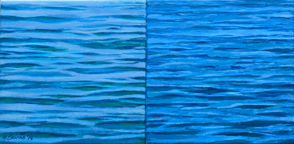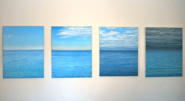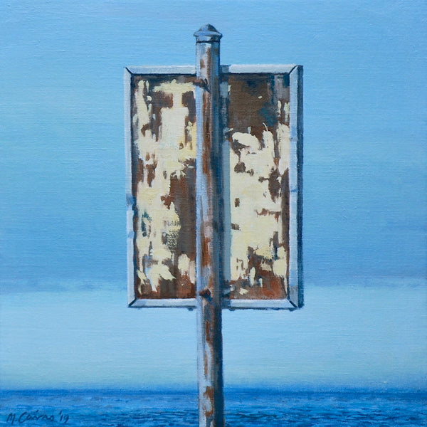 Blue Latitude is a body of work in which Cairns uses focal points of difference to underscore compositional experimentation. It is evident that he began his artistic journey in the articulate world of graphic design as balance, contrast and detailed execution of his brushwork are all present reminders. Waterway II and Bay XII are prominent examples of Cairns depth and technical capacity in his painterly pursuits. The four panel work Seasons compliments his consistent study of nature and nature’s movements intimately. Cairns has successfully navigated design and scale delineating calm. Artists are often reconnoitering the urban spaces. Cairns has documented the streets of the sea, carefully contemplating essential markers and producing icons of our beloved coastline.