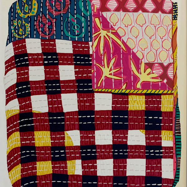 "If I can’t see the edges of a quilt or blanket sometimes it can appear to me to be not that different from an abstract painting or landscape. In this series of works, I hone in on what I really love about textiles and apply it to paintings which could be read as a cropped in image of something woven or stitched, but if you get right in there, these paintings could also be understood purely as abstract shapes or landscapes.