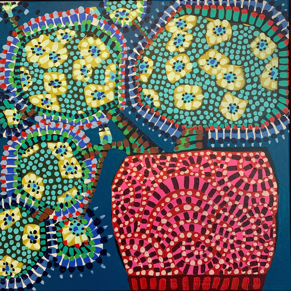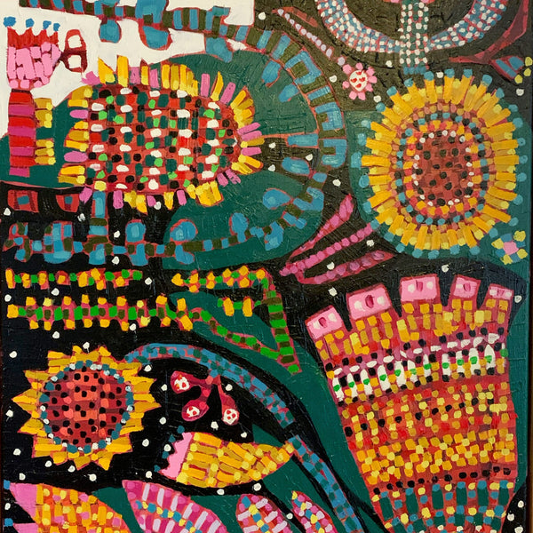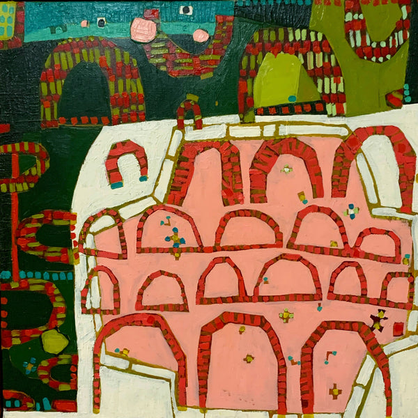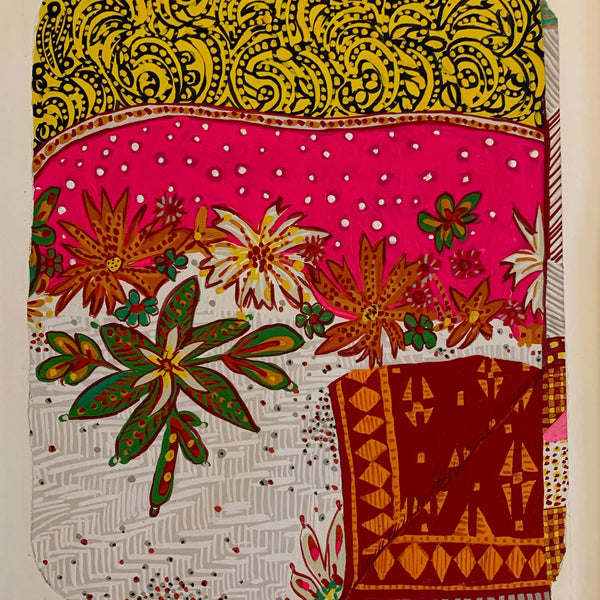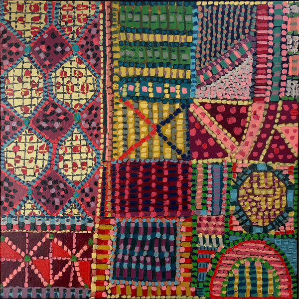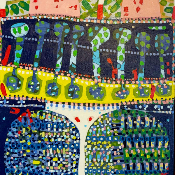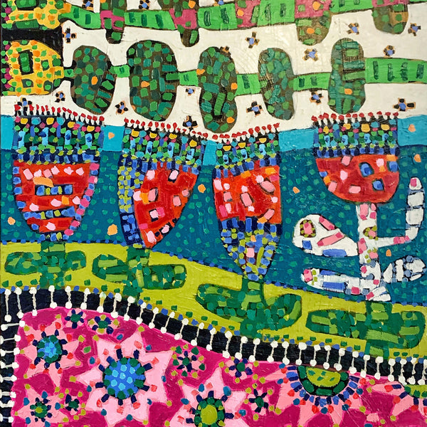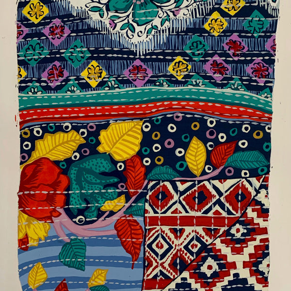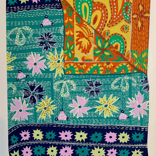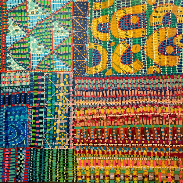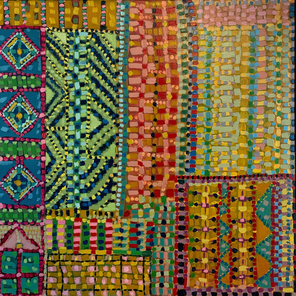 Having come from a career in Textile Design, my work is heavily inspired by textiles and patterns of many variations. I'm driven by the need to create paintings because of my love of colour and pattern. I find the act of painting itself, deeply satisfying, meditative and therapeutic. As I go about making one of my works, I rarely know what the outcome will be. I prefer to go on an 'adventure' by building up layers of paint, reacting to shapes and marks made below. It's a somewhat hypnotic process of retain-delete-retain-delete until I find the end of the work."