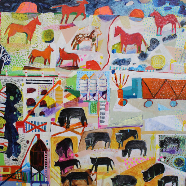 "Northwest of Geelong are three volcanic cones, The Anakies, that last erupted around 1.5 million years ago. Known by some as the “little hills” or “three sisters” they are now the site of substantial quarry operations with the southernmost cone destined for complete removal. These works consider activity in the surrounds of these beautiful, sentinel forms. This sense of place is expressed in interior scenes and external scenes. Fragments of life and land that I see around The Anakies I have picked, unpicked and recombined to make physical and psychological scapes.