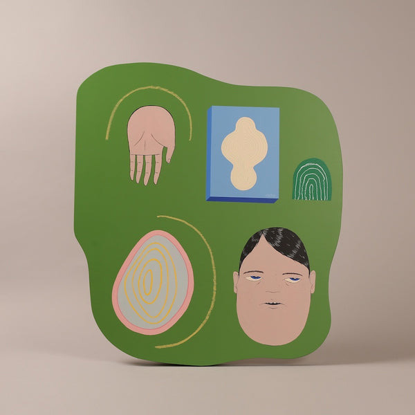 In this new exhibition he explores his past works through memories and photographs and applies them in new ways using sculpture and painting - combining abstract forms with figurative illustrations. Work is created out of carved wood, acrylic paint, enamel paint, oil markers and poly urethane castings.