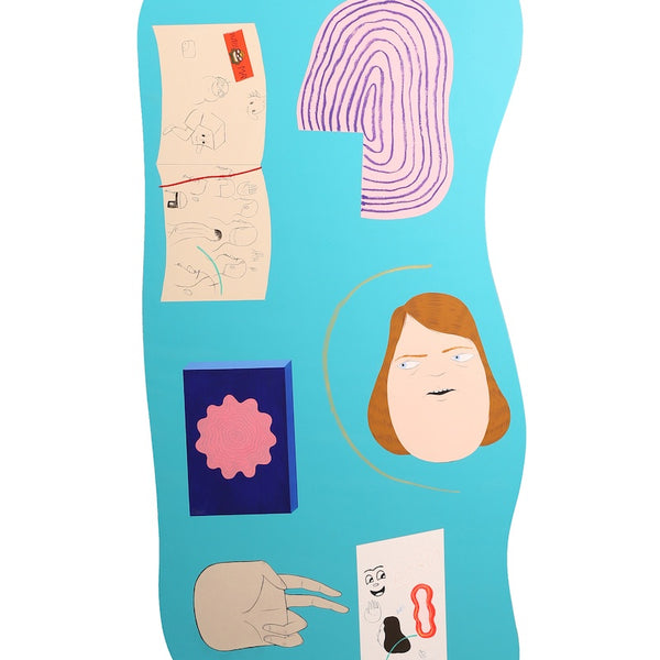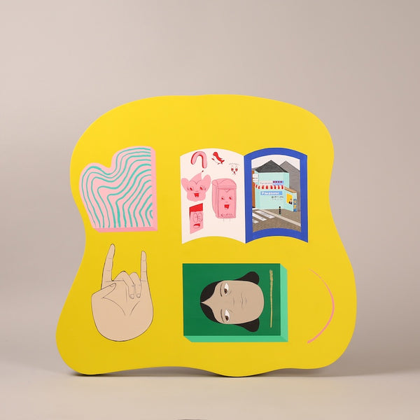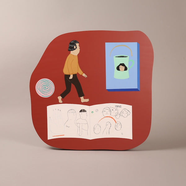 Within the work there are finely detailed illustrations taken from photos, paired with bold abstract shapes and stylised characters. Together these elements create a storyboard - autobiographical reflections and distant memories made up of bold shapes and colours.