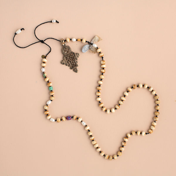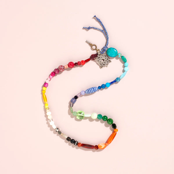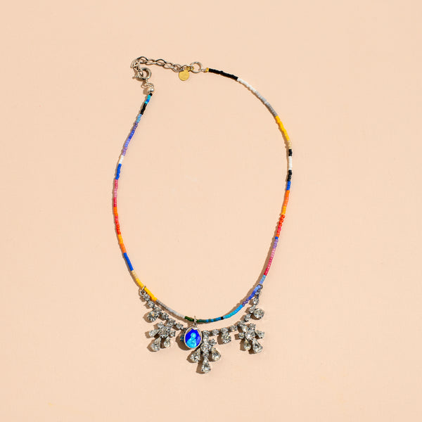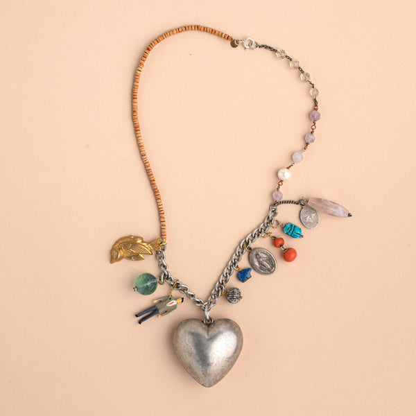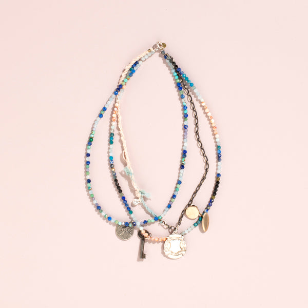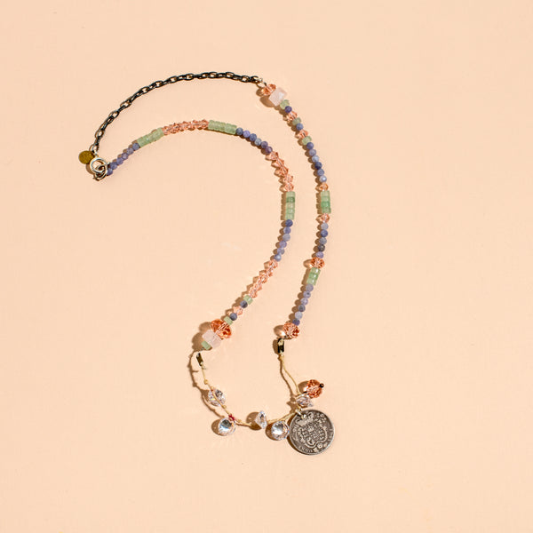 Materials used are mainly repurposed antique or vintage components with semi-precious, glass, fabrics, brass and sterling silver as the basis of the designs.