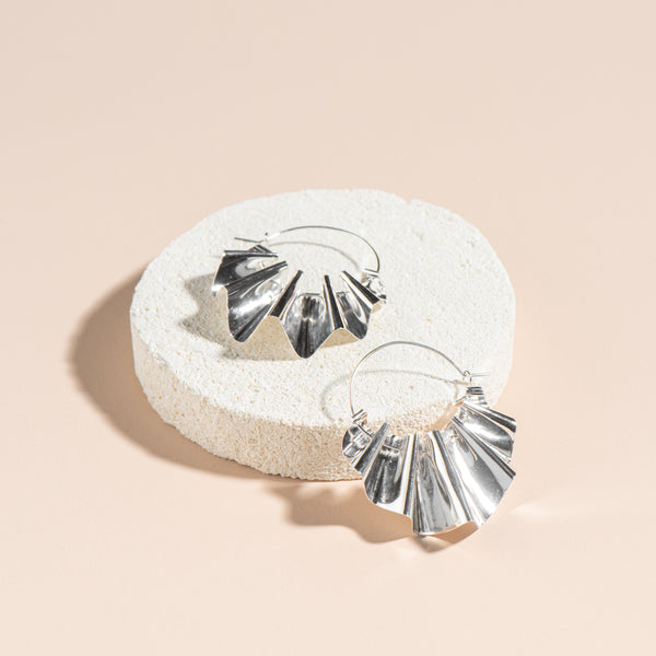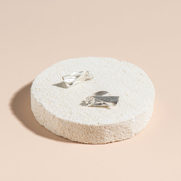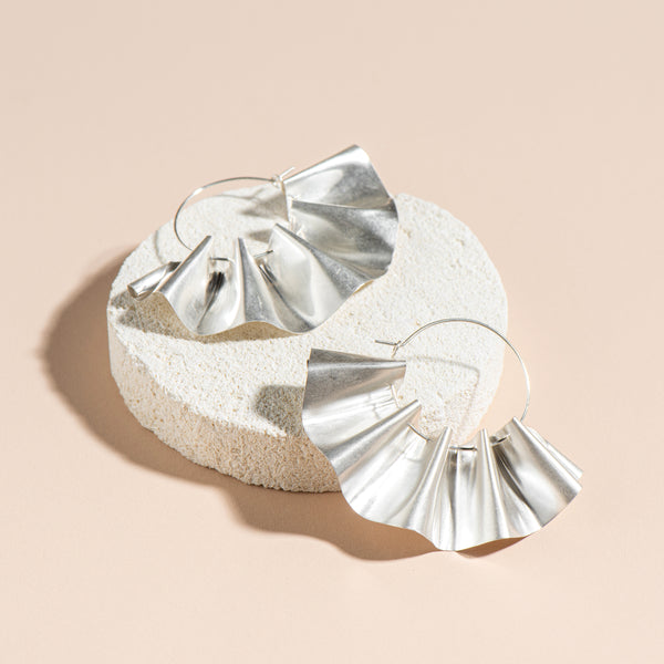 My work explores the materiality of fine silver sheet metal, which is highly malleable. I refine this metal through a rolling down process, pushing the metal to its limits. The result is a thin, delicate material that I can manipulate in the same way as a stiff fabric. With this process, I mimic in metal the movement and folds of fabric. All of my work is handmade, and no two pieces are the same.
