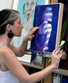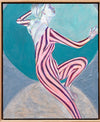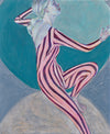 Belinda draws on her natural curiosity for the vastness of the known and unknown universe through suspending her figures in untethered perspectives amidst abstract plains, and moving her compositions abruptly between moments of calm and flurries of ferocity. Belinda also creates subliminal movement within her compositions by building up masked areas of textured moulding paste, opaque colours, and oil sticks. In her preliminary stages Belinda designs and tailors costumes for her models, then works closely with them in creating reference images, all shot from an aerial perspective.