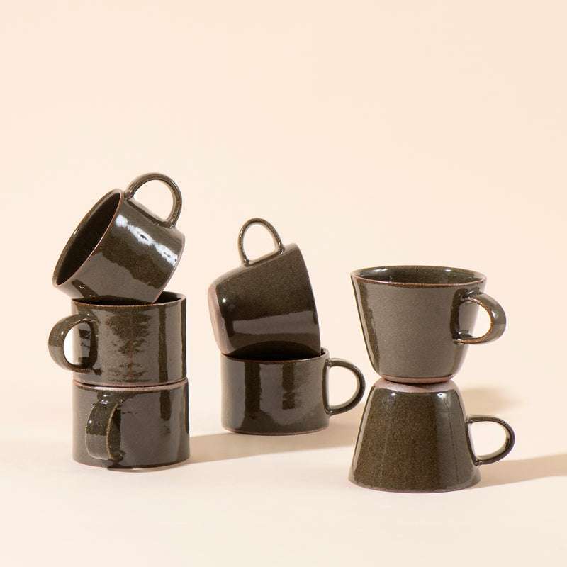 Handmade on the pottery wheel using high-fired stoneware clay. Glazed in glossy forest green on dark, textured clay.