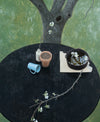 "These works were inspired by the beginning of spring, new blossoms, particularly fruit trees. I decided to make two outdoor still life paintings, because I was working on a lot of landscape painting at the same time. I like overcast light because it’s soft and can feel quiet, it also lets you see nice subtlety in form and colour, as opposed to the harsh light and shadow of direct sunlight, which also has its place. I spent quite a while arranging and playing with the layout of the objects on the table, which was an enjoyable part of the process. For me, these paintings are about mood, but also have the feeling of an underlying narrative."