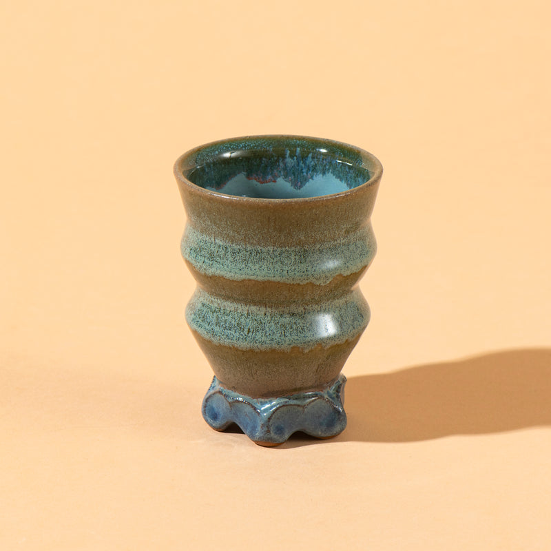 A beautiful hand built beaker with coloured glaze patterns and markings.