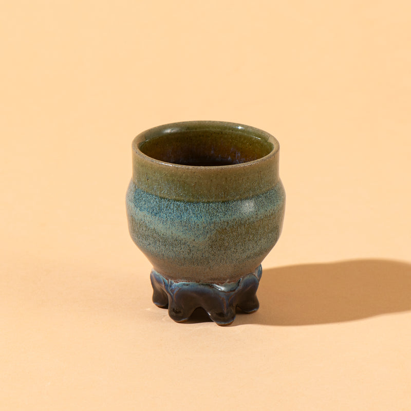 A beautiful hand built beaker with coloured glaze patterns and markings.