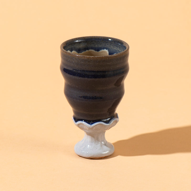 A beautiful hand built beaker with coloured glaze patterns and markings.