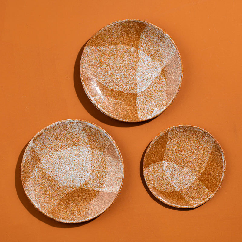 These handmade pottery plates are the perfect combination of sweet sandy clay and lush white glaze. The dark shino colourway is a slightly darker caramel colour to the light shino colourway.
