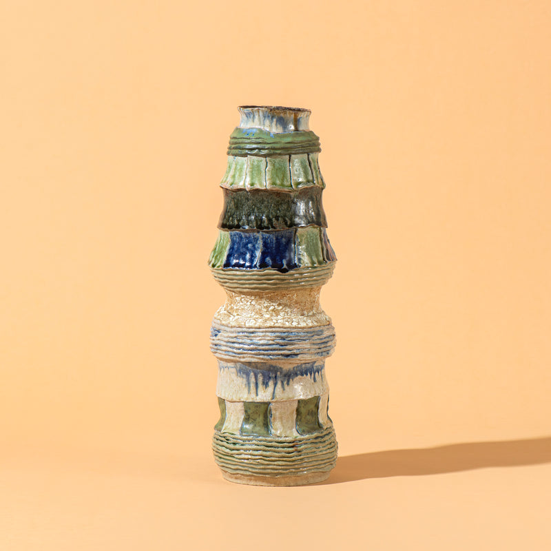 handbuilt vase, white raku clay, cobalt, copper, rutile & ash glazes, cone 6 oxidation