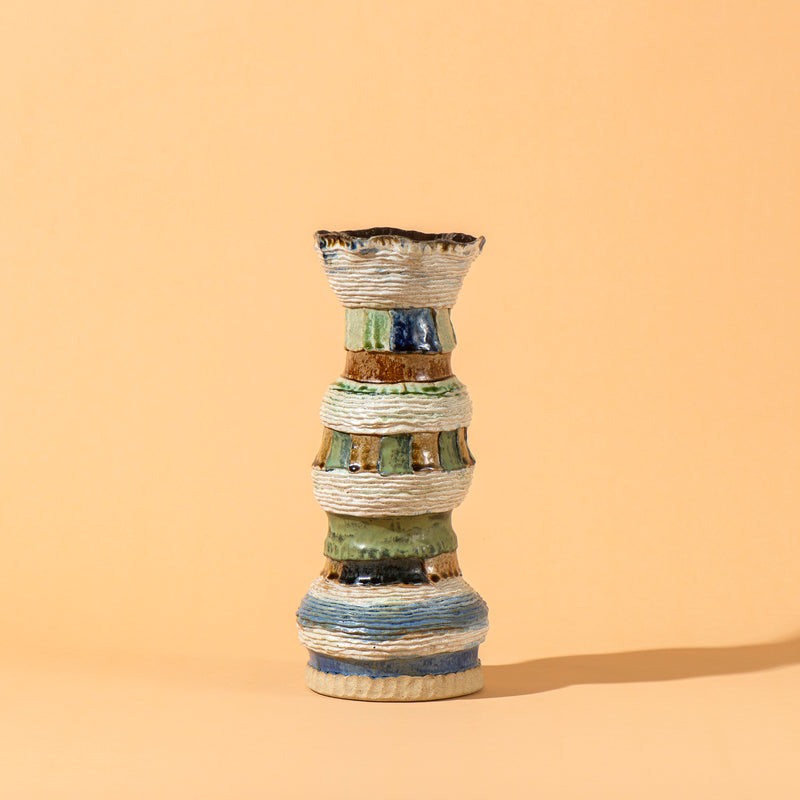 handbuilt vase, white raku clay, cobalt, copper, rutile & ash glazes, cone 6 oxidation