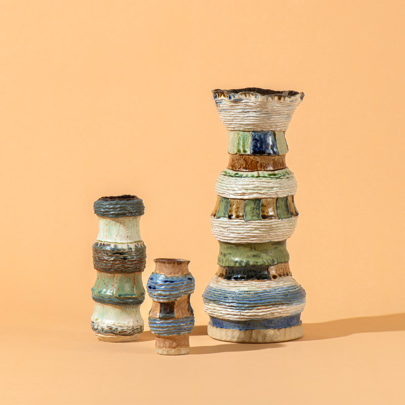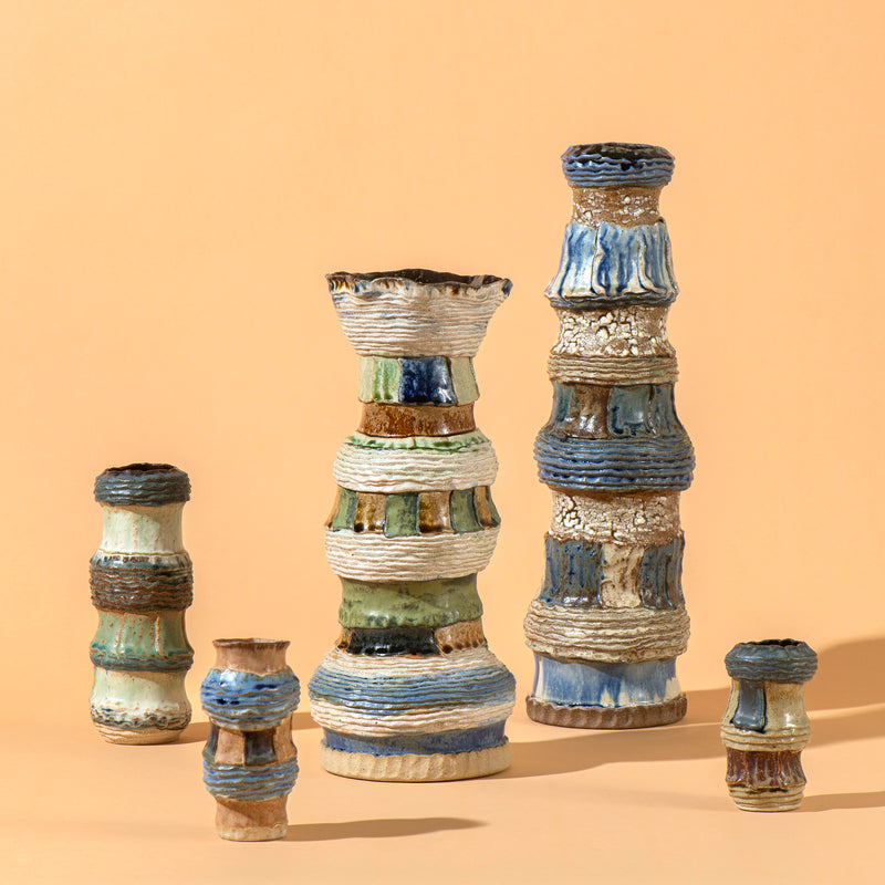 "'Reverie' explores the idea of poetic daydreaming as a generative space of creation. The ceramic works were imagined and hand built with clay as joyful meditations. Using pinched coils and slabs, the gestures of making formed textured surfaces for the glazes to gather, form rivulets, and pool in crevices and impressions left by my fingertips. Through contemplation and repetition, the process of making became a dialogue between my inner landscape and the physical world, between fleeting thoughts and lasting form."
