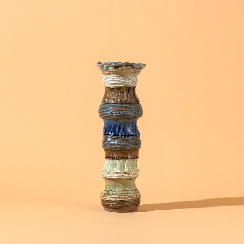 "'Reverie' explores the idea of poetic daydreaming as a generative space of creation. The ceramic works were imagined and hand built with clay as joyful meditations. Using pinched coils and slabs, the gestures of making formed textured surfaces for the glazes to gather, form rivulets, and pool in crevices and impressions left by my fingertips. Through contemplation and repetition, the process of making became a dialogue between my inner landscape and the physical world, between fleeting thoughts and lasting form."