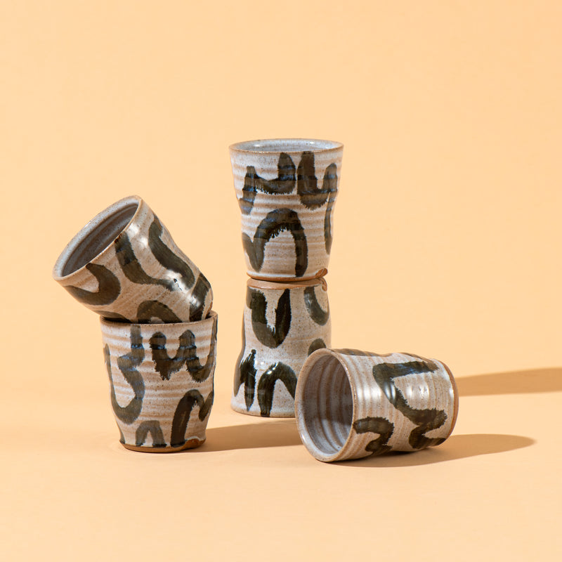 A beautiful hand built beaker with coloured glaze patterns and markings.